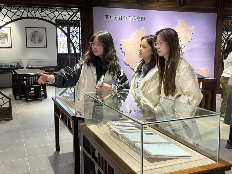 在山塘街苏州南社纪念馆内,师生党员跟随讲解员参观展区陈设,研读珍贵史料、历史图片和实物文物,重温南社1909年在苏州正式成立后,以文化宣传和文学创作为武器,以振兴中华为宗旨,与同盟会相配合,致力于推翻清王朝的封建专制统治的奋斗历史;深刻感悟爱国、创新、进取的南社精神。