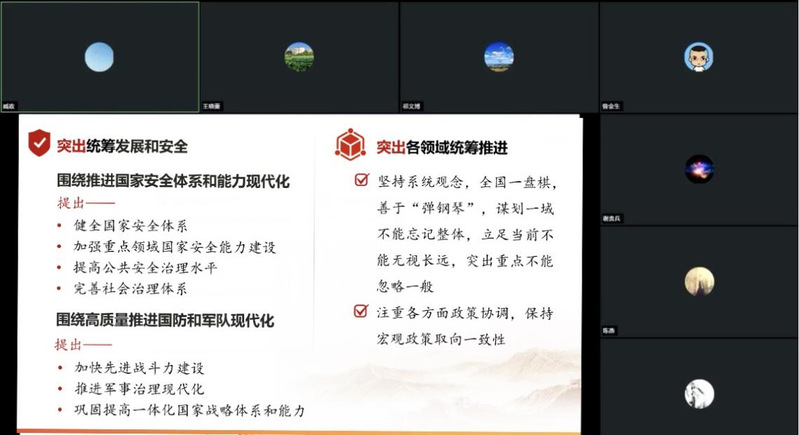 在第十一个全民国家安全教育日来临之际,为深入学习贯彻习近平法治思想和总体国家安全观,提升思政课教学的针对性和实效性,苏州大学马克思主义学院形势与政策教研室、军事理论教研室于2026年4月7日联合举行线上集体备课会。会议聚焦“统筹发展和安全 护航‘十五五’新征程”主题,围绕国家安全相关教学内容展开深入研讨。会议由形势与政策教研室主任王晓蕾主持。
