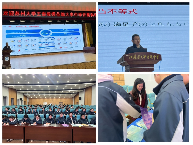 2026年4月22日,苏州大学数学科学学院王奎副教授与盐城招生组副组长、马克思主义学院党委副书记蒋慧走进江苏省大丰高级中学开展专题讲座和招生宣传工作,进一步深化我校与盐城地区重点中学的联系纽带。