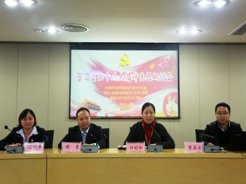 11月17日晚,苏州工业园区胜浦实验小学党总支联合中国银行苏州工业园区唯亭支行、胜浦支行联合党支部共同举行学习贯彻党的十九大精神专题研讨会。苏州大学马克思主义学院党的十九大精神博士生宣讲团成员、马克思主义学院干部学院办公室主任吉启卫应邀做了党的十九大精神宣讲报告。胜浦实验小学校长、党总支书记计利珍,中国银行苏州工业园区唯亭支行行长顾震,胜浦支行行长沈利英和胜浦实验小学党员70余人聆听了宣讲报告。宣讲报告由计利珍主持。