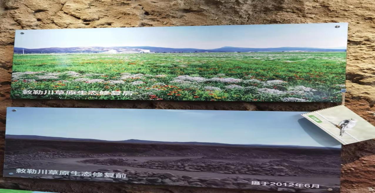 (图为呼和浩特敕勒川草原生态修复前后照片,经过生态修复的敕勒川草原真正呈现出一副“天苍苍,野茫茫,风吹草低见牛羊”人与自然和谐相处的优美画面。)