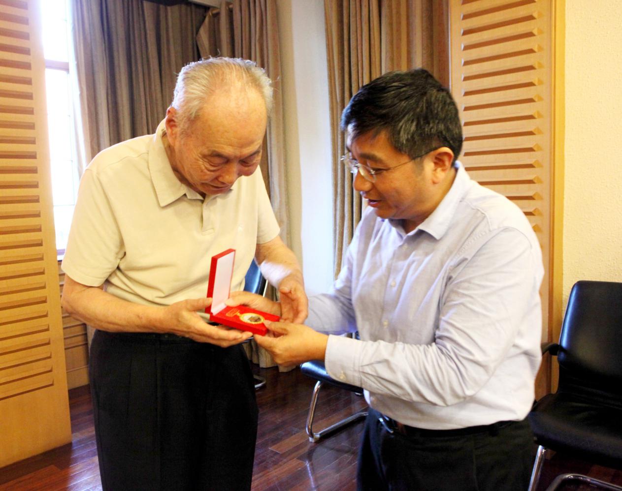 会议开始前,举行了党龄满50年老党员荣誉纪念章颁发仪式,江涌书记为五位老党员代表颁发了荣誉纪念章。该纪念章由我校艺术学院张大鲁教授设计制作,纪念章上“不忘初心、牢记使命”八个熠熠夺目的大字与金灿灿的党徽和苏大标志性建筑——钟楼相互辉映,彰显了一代又一代苏大人牢记使命、担当作为的初心本色。