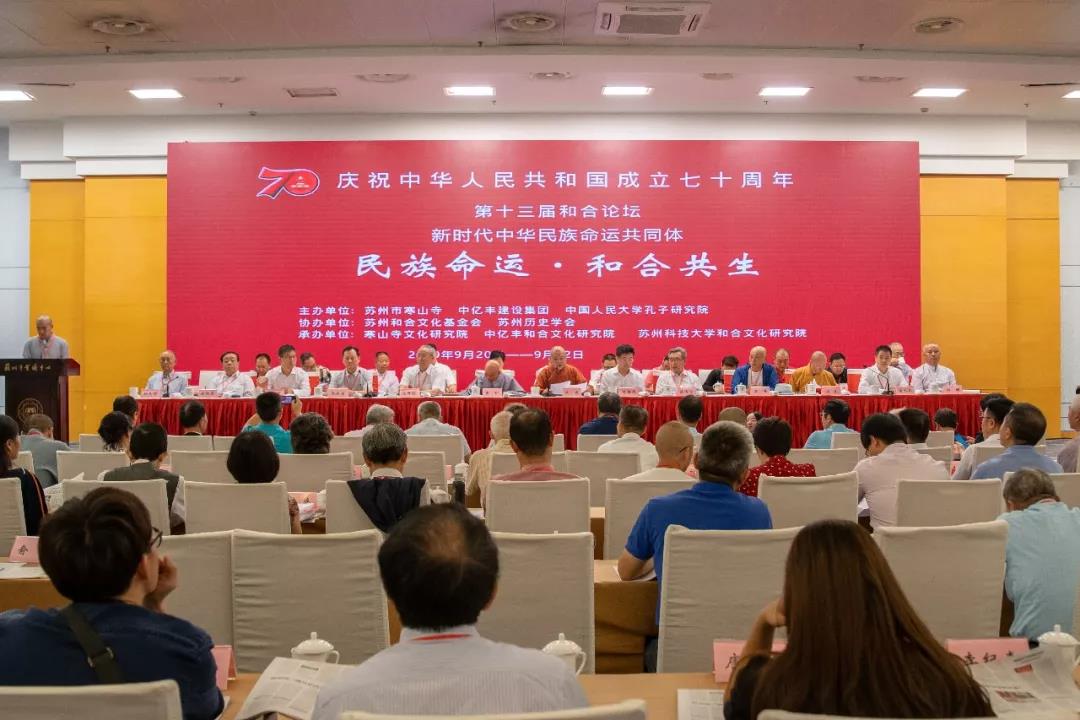 习近平总书记曾指出:“和衷共济、和合共生是中华民族的历史基因,也是东方文明的精髓。”千百年来,中华民族焕发出强大的凝聚力和向心力,各民族在波澜壮阔的历史中荣辱与共、生生不息、不断发展。壮丽七十年,奋斗新时代,第十三届和合论坛“新时代中华民族命运共同体”学术研讨会于9月21日在苏州市会议中心召开,本届论坛由苏州寒山寺、中亿丰建设集团、中国人民大学孔子研究院主办,苏州和合文化基金会、苏州历史学会协办,寒山寺文化研究院、中亿丰和合文化研究院、苏州科技大学和合文化研究院承办。由苏州科技大学校级领导、寒山寺文化研究院院长姚炎祥教授主持。