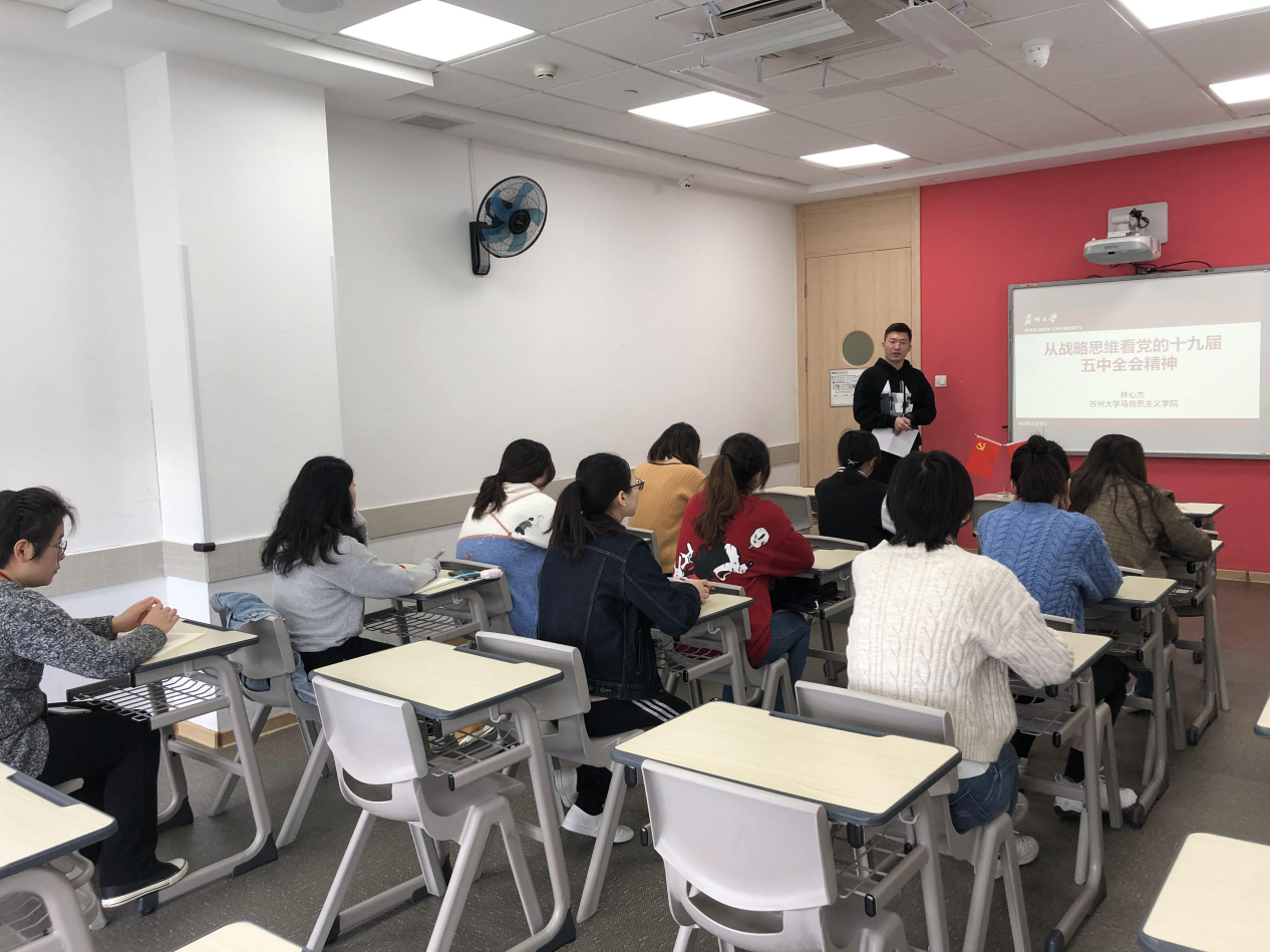 11月5日,苏州大学马克思主义学院研究生党员服务中心执行主任林心杰受邀参加了新东方苏州学校党委开展的主题党课培训活动。林心杰围绕党的十九届五中全会精神,以科学思维为切入点,为新东方苏州学校的学员作主题为“从战略思维看党的十九届五中全会精神”的党课培训。活动由程维娜老师主持。