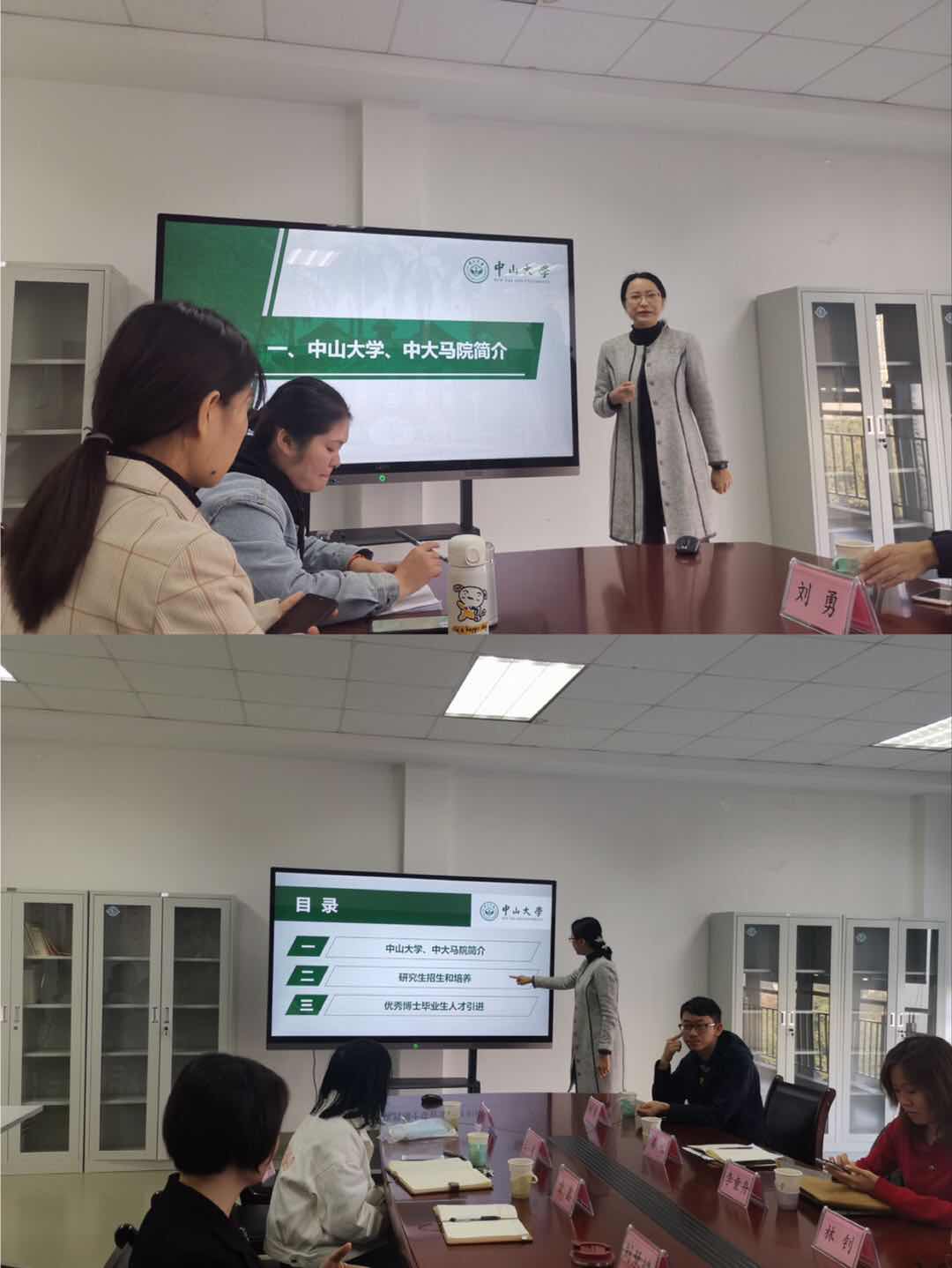 刘慧婷主任介绍了学院的思政课教学工作以及日常行政管理等工作,她提到马院正在加速发展中,希望后期能以各种形式与中山大学马克思主义学院继续开展交流,相互吸取经验共同实现新发展。金鑫老师简要介绍了近几年来马院研究生党团支部的建设发展状况及学院毕业生的就业情况,并表示对未来马院的发展充满信心。