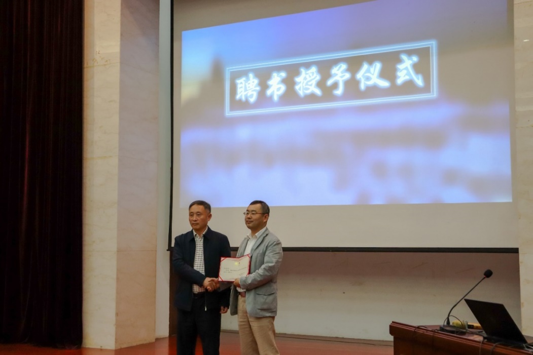马克思主义学院院长田芝健教授向苏州市科学技术协会副主席倪志强颁发聘书,聘请倪志强为马克思主义学院形势与政策兼职教授。