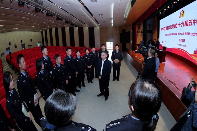 11月15日上午,学习贯彻党的十九届五中全会精神江苏省委宣讲团成员、苏州大学马克思主义学院院长田芝健教授到江苏警官学院作宣讲报告。报告会由省公安厅党委委员、学院党委书记夏存喜主持。