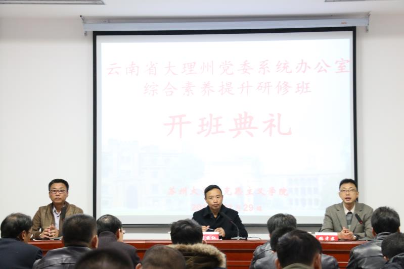 2017年11月28日—12月5日,苏州大学马克思主义学院干部学院顺利承办了大理州党委系统办公室提升综合能力素养研修班。苏州大学马克思主义学院党委书记张才君致辞,大理州委副秘书长、州委办公室主任肖云江做开班动员讲话,苏州大学马克思主义学院干部学院办公室副主任、带班老师石利军主持开班典礼。