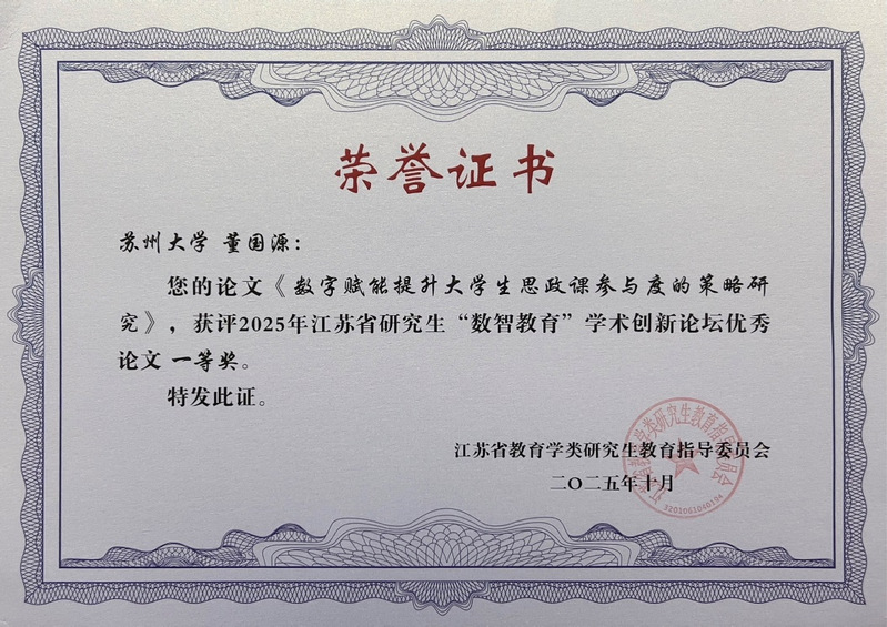 2025年10月18日,由江苏省教育学类研究生教育指导委员会主办,江南大学承办,江南大学人文学院、教育学院协办的江苏省研究生“数智教育”学术创新论坛在江南大学人文学院成功举办。苏州大学马克思主义学院2024级硕士研究生董国源提交的论文《数字赋能提升大学生思政课参与度的策略研究》成功入选并荣获论坛优秀论文一等奖。