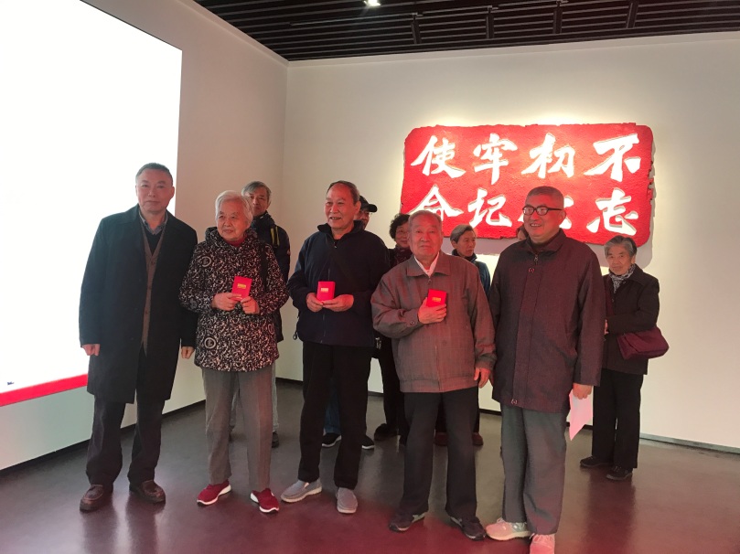 在初心馆,观看了习近平总书记关于“不忘初心、牢记使命”的重要讲话后,马克思主义学院举行了庄严的“五十年党龄荣誉纪念章”颁发仪式,仪式由丁家钟老师主持,丁家钟老师向党龄满五十年老党员致敬,宣读了9位党龄满五十年党龄老党员名单,分别是钱锋、俞朝卿、谢自成、赵宝余、陈慰慈、朱奎保、马拓白、赵文博、余水大九位老党员。苏州大学组织部原部长、苏州大学马克思主义研究院院长朱炳元教授给各位老党员颁发了荣誉勋章。老同志们满是喜悦和感动,马上把奖章佩戴起来,参加了后续活动。