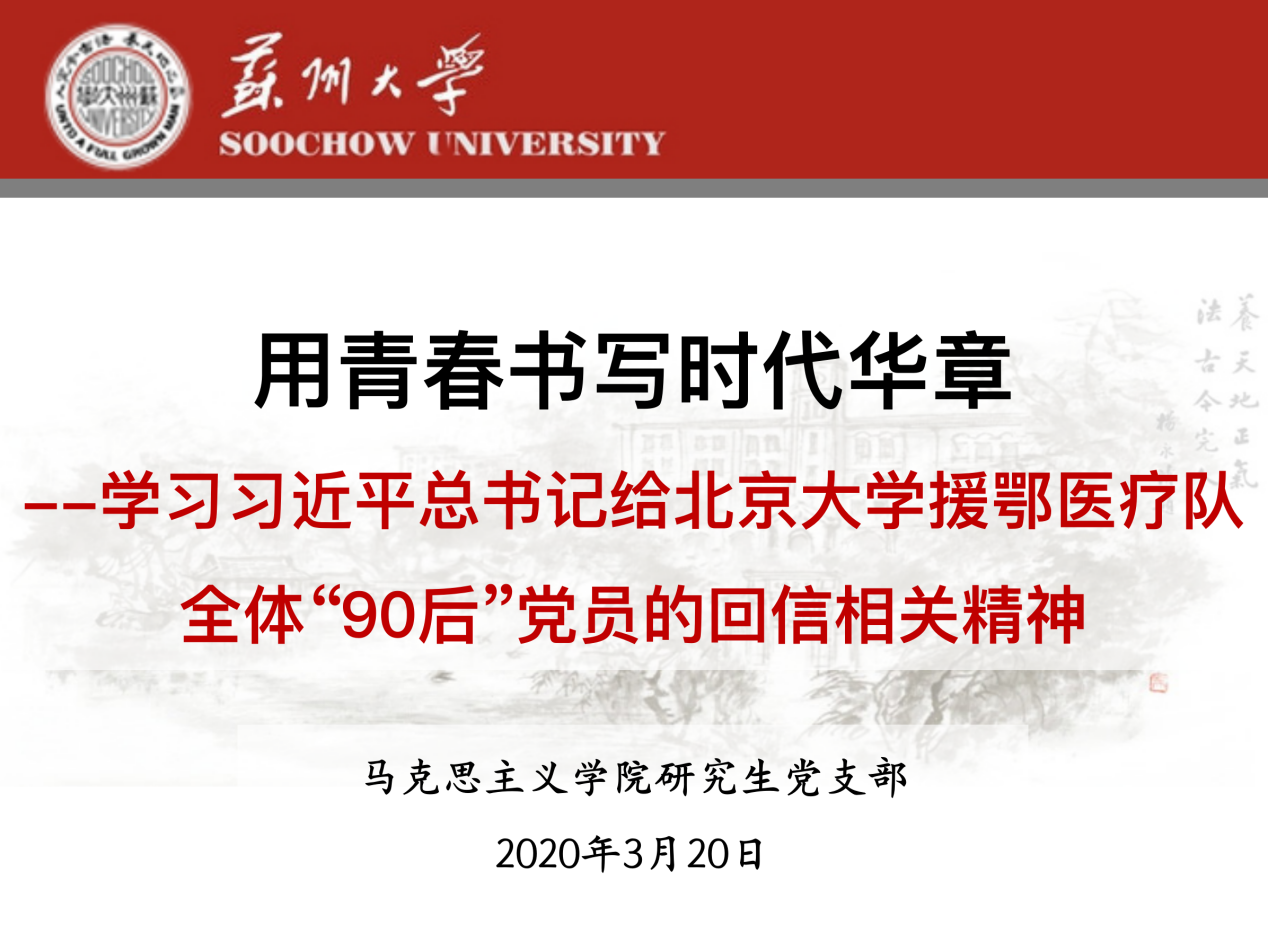 自新冠肺炎疫情防控的人民战争、总体战、阻击战打响以来,无数党员青年以高度的时代使命感和强烈的社会责任感奔赴一线,勇敢逆行,为保护人民生命健康,控制疾病扩散贡献了磅礴青春力量。习近平总书记3月15日给北京大学援鄂医疗队全体“90后”党员回信,向他们和奋斗在疫情防控各条战线上的广大青年致以诚挚的问候。为全面深刻领会习近平总书记的回信精神,认真学习一线抗疫青年的优秀感人事迹,进一步增强党员青年的党性修养和家国情怀,苏州大学马克思主义学院研究生党支部于3月20日在“学习强国”平台在线开展了“用青春书写时代华章——学习习近平总书记给北京大学援鄂医疗队全体‘90后’党员回信相关精神”主题党日活动。本次党日活动由青年与文体委员周心欣主持。