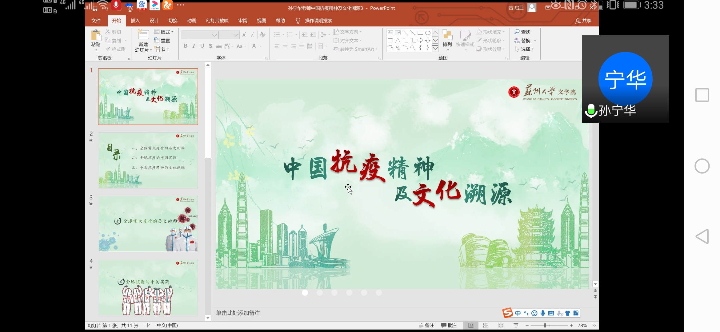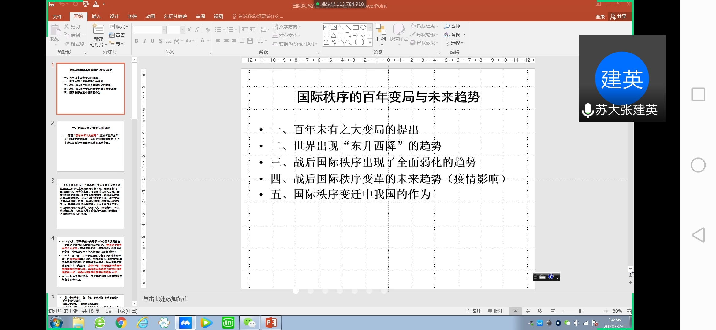 根据议程,杨渝玲教授、宋德孝教授、范俊玉副教授、孙庆民研究员、郑芸副教授、许冠亭教授、朱蓉蓉教授、张建英副教授分别代表《中国马克思主义与当代》教研组的《当代发展问题》《当代社会思潮》《当代生态环境问题》《当代科学技术发展》《当代中国发展战略布局》《当代社会治理》《当代社会主义的新发展与苏南实践》《当代世界经济政治格局》的八个专题教研组,姜建成教授代表《学术规范与学术诚信教育》教研组,孔川副教授代表《时事政治》教研组分别汇报了本教研组专题教案课件完善情况和录播准备情况。孙宁华教授、王淼教授围绕抗疫精神的文化溯源、学术诚信与学术责任等发言,与会成员认真听取汇报,并围绕教案课件完善、教学重点、录播安排等进行了研讨,提出了具体建议。