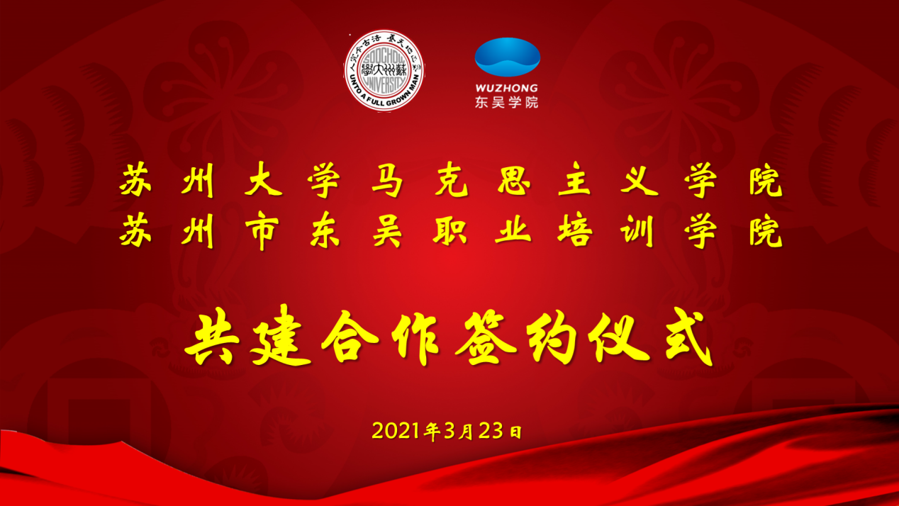 2021年3月23日,苏州大学马克思主义学院与苏州市东吴职业培训学院共建合作签约仪式在苏州市东吴职业培训学院教育培训基地雍景山庄举行。江苏吴中集团有限公司党委书记、董事、副总裁卓有、党委办主任吴晔,苏州市东吴职业培训学院理事长黄熙宗、院长赵卫,苏大马院党委书记陈建军、院长田芝健、研究员张才君、副院长茆汉成等出席签约仪式。