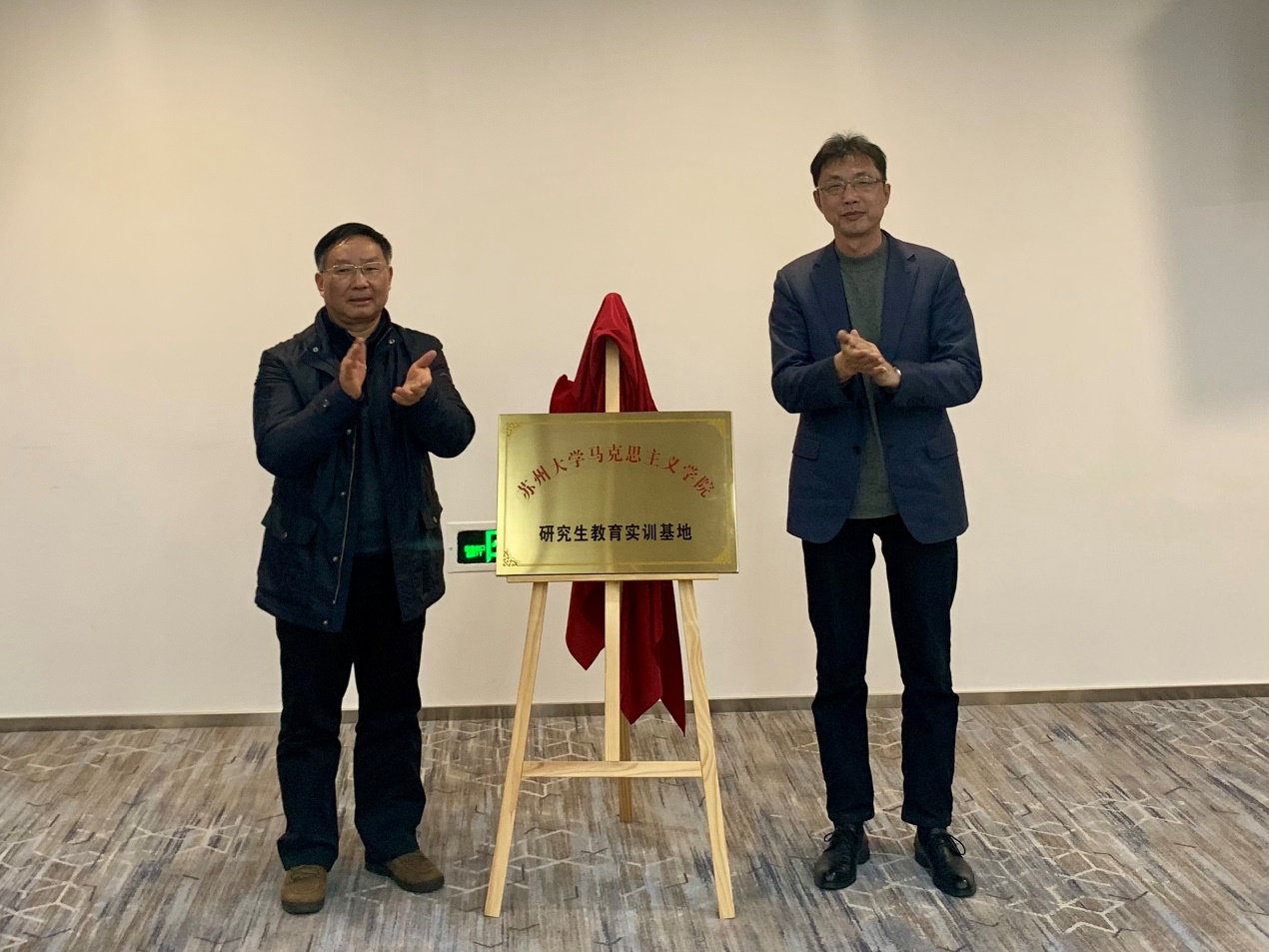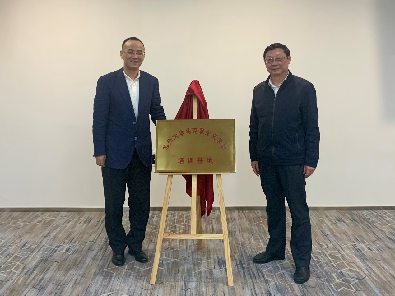 苏州市东吴职业培训学院院长赵卫与苏州大学马克思主义学院院长田芝健签署共建合作协议,江苏吴中集团有限公司党委书记、董事、副总裁卓有、苏州市东吴职业培训学院理事长黄熙宗,苏州大学马克思主义学院党委书记陈建军、研究员张才君共同为“苏州大学马克思主义学院培训基地”、“苏州大学马克思主义学院研究生教育实训基地”揭牌。