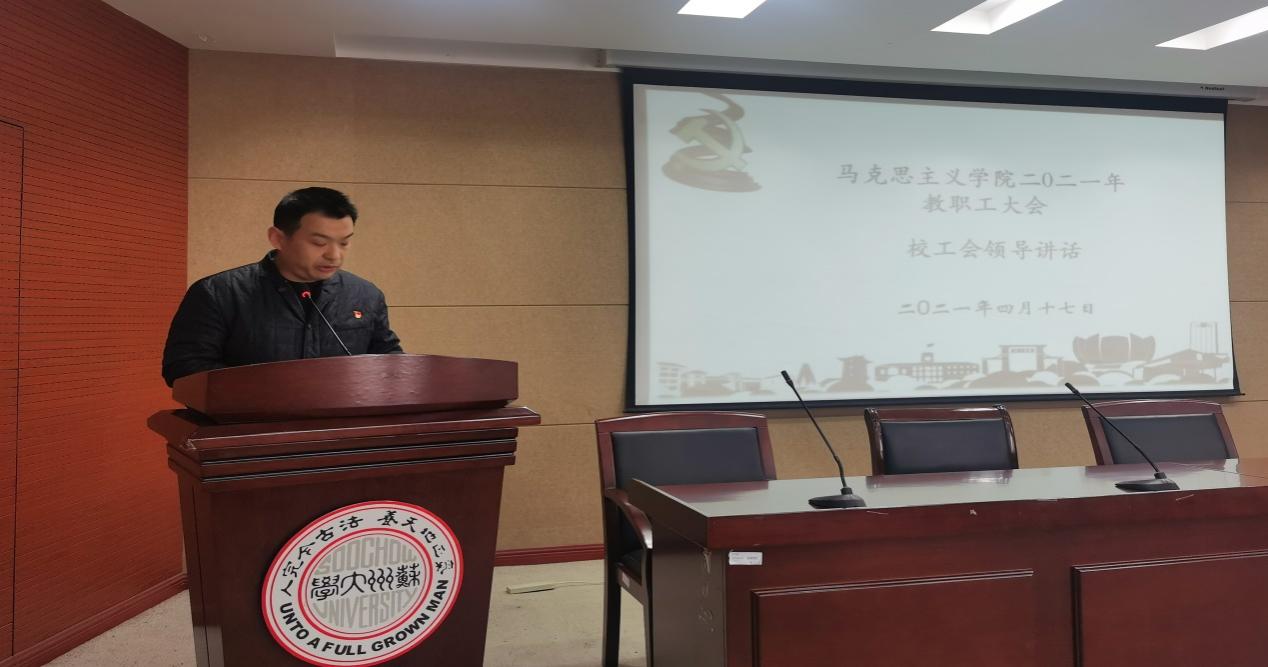 4月17日,苏州大学马克思主义学院2021年度教职工大会在独墅湖校区606-6403会议室召开。马克思主义学院教职工出席了会议,苏州大学工会副主席顾志勇应邀到会指导。大会由学院党委书记陈建军主持。