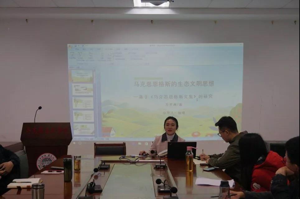 紧接着,杨璠向大家分享了方世南教授的《马克思恩格斯的生态文明思想——基于<马克思恩格斯文集>的研究》一书。杨璠从马恩文集出发,分析了马克思恩格斯著作中关于生态文明思想的论述,她强调:“马克思恩格斯不仅有红色思想,也有绿色生态思想,马恩关于生态文明的论述与当代生态文明概念具有内在的关联性和一致性。”