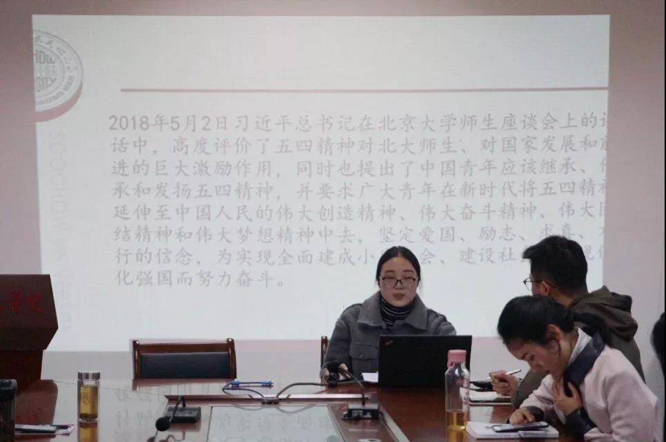 一百年前的“五四”青年爱国运动掀起了广大青年的爱国热潮,开创了中华的历史新纪元。干蒙蒙从“不忘初心,传承五四精神”和“继续前进,弘扬五四精神,勇担历史使命”两个方面展示了“从五四精神看新时代青年大学生的责任和使命”。干蒙蒙指出,从五四运动的历史我们可以发现,青年知识分子只有同工农群众相结合,才能产生巨大的力量。当前,青年大学生更应该将学到的知识深入到实践中去。尚晨靖从《新青年》入手,分析了马克思主义在中国的初始传播和广泛传播。《新青年》杂志,在那个令人窒息、内外交困的历史岁月中,曾改变了一代青年人的人生价值取向,被誉为激活五四新文化运动的精神元典。尚晨靖强调,新时代下我们要做有理想、有本领、有担当的新青年。青年兴则国家兴,青年强则国家强。青年一代有理想、有本领、有担当,国家就有前途,民族就有希望。王玉妹同样从《新青年》入手,将《新青年》传播马克思主义的历程分为“自然”、“自觉”、“自由”三个阶段,指出,《新青年》为马克思主义中国化提供语境、锻造一批坚定的马克思主义者并且激发民众救亡图存的革命热情。新时代下的青年人要巩固主流意识形态的领导地位,抵制错误思潮;秉承马克思主义原则与立场,坚定理想信念;重视理论与受众的同频共振,形成良性互动。