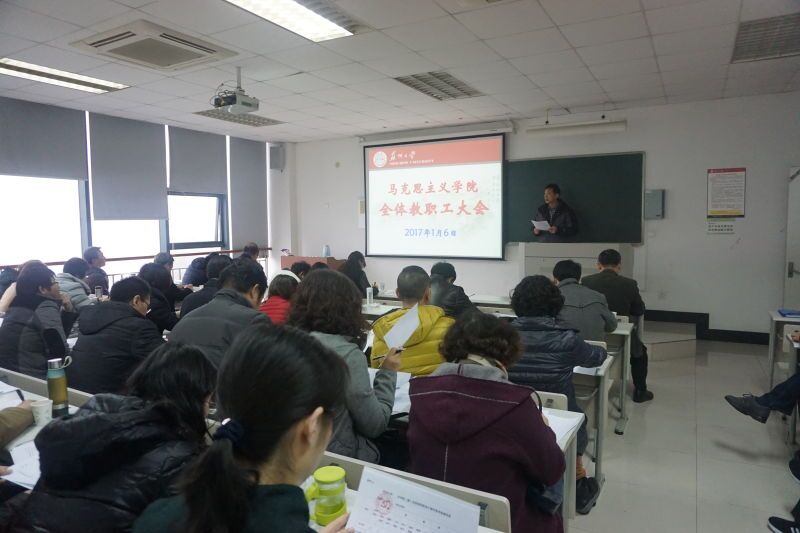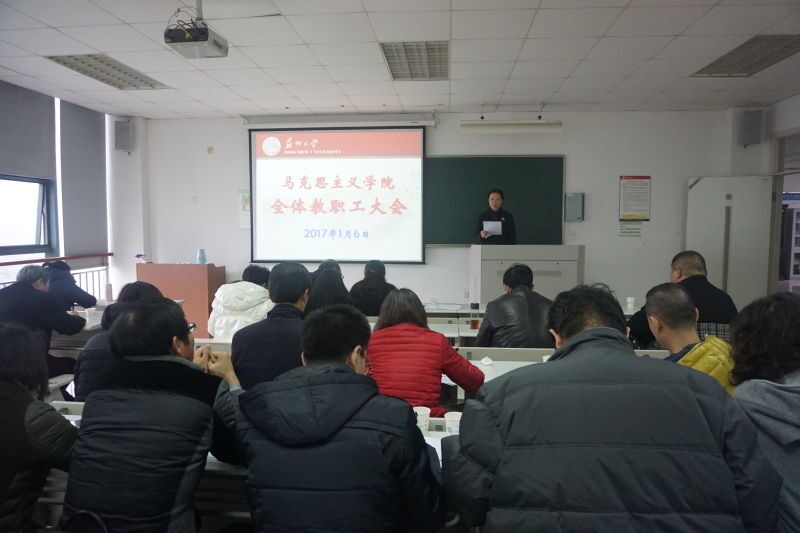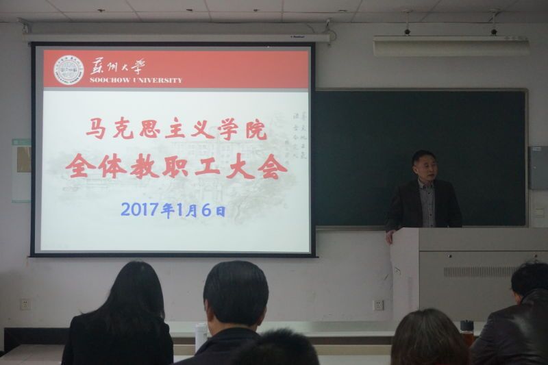 首先,田芝健院长对马克思主义学院2016年的工作进行了简要回顾和总结。他指出,这一年,在学校党政领导下,在学校各职能部门各项指导下,在全院师生员工共同努力下,克服学院单独组建起步阶段的诸多困难,坚持艰苦奋斗、锐意改革;坚持积极有为、从容而为;坚持抓住重点、全面推进,学院工作开局和总体运行良好。2016年6月,我院成功获批全省高校示范马克思主义学院,马克思主义理论学科成为省“十三五”重点学科。院党政联席会议高效运作,各项工作按照议事规则和学院分工有序运行,院综合办公室和教学科研办公室注意树立服务意识,提高服务能力。田院长具体从以下方面对2016年的工作进行了总结:第一,教学改革不断深化。全体教师克服教学工作量超负荷、绩效分配不明朗、多校区连轴上课等困难,本科生、研究生思想政治理论课教学改革创新不断深化,与纳米学院和敬文书院的教改合作有效推进,在校内外产生了积极反响。学院组织有关课程教研部对一线教师创新教学法进行了提炼总结;与复旦大学、园区创业大学合作开展的创新创业素质能力课程试点取得预期目标;教学成果奖培育工作扎实推进。但是,全员教学质量提升面临新的机遇和挑战,提升空间很大。第二,科学研究取得进展。设立院级科研项目支持中青年教师开展前期预研;朱炳元教授的重大项目取得了一批高端研究成果;方世南教授科研成果又多又好,有的得到省、市领导的批示;学院组织申报的教育部重点项目获得立项;学院研究生也在省社科学术大会上分别获得多个奖项。多名研究生课题入选省研究生创新工程。成立了五个具有马克思主义理论学科特色的院级研究中心并有效开展工作。但是科研工作必须增强问题意识,要有危机感和紧迫感。第三,社会实践基地建设和社会服务方面也进行了有益探索。借助于科研团队与中国银行、中国建设银行、吴江七都镇、同程网等单位的合作,在这些单位设立了一批社会实践基地和研究生工作站。倡导成立了高校思想政治理论课区域协同创新中心。田芝健院长提出,社会服务和教学科研是相辅相成的,我们要努力做到既要能在课堂上高谈阔论,深入浅出,也要提高在社会实践中解决实际问题的能力。2016年,学院在干部培训方面做了一些探索——以服务求生存,以贡献求发展,拓展了面向各地干部传播马克思主义理论、传播以习近平同志为核心的党中央治国理政的新理念新思想新战略的渠道。但是,与社会力量协同创新人才培养仍需深入探索;第四,在学院内部管理方面,成立了教职工大会和大会执委会。按照民主管理要求,尊重教职工意见,坚持涉及到教职工利益的事项必须走民主程序,在实践中完善政策方案。学院工作中也存在一些不足和问题:推动政策落实要增强执行力、工作创新力度还不大、制约学院发展的瓶颈有待突破、师资队伍建设亟待补充基本师资和引进高层次人才、调动教学科研积极性的办法有待探索、有的工作主动性、自觉性、创造性有待增强等等。最后,田芝健院长强调,学院一切工作都要坚持党的领导,把党的领导和党的建设贯穿学科建设与学院发展的全过程。推进高校思想政治理论课体系创新,加强马克思主义理论学科建设,推进马克思主义学院发展,正面临重大的机遇和挑战。院党政领导班子要进一步加强自身建设,努力团结和带领全院师生员工深入贯彻全国高校思想政治工作会议精神,进一步深化教学改革,推进科学研究,创新立德树人,加强社会服务,共同团结奋斗,学院的未来会更好。