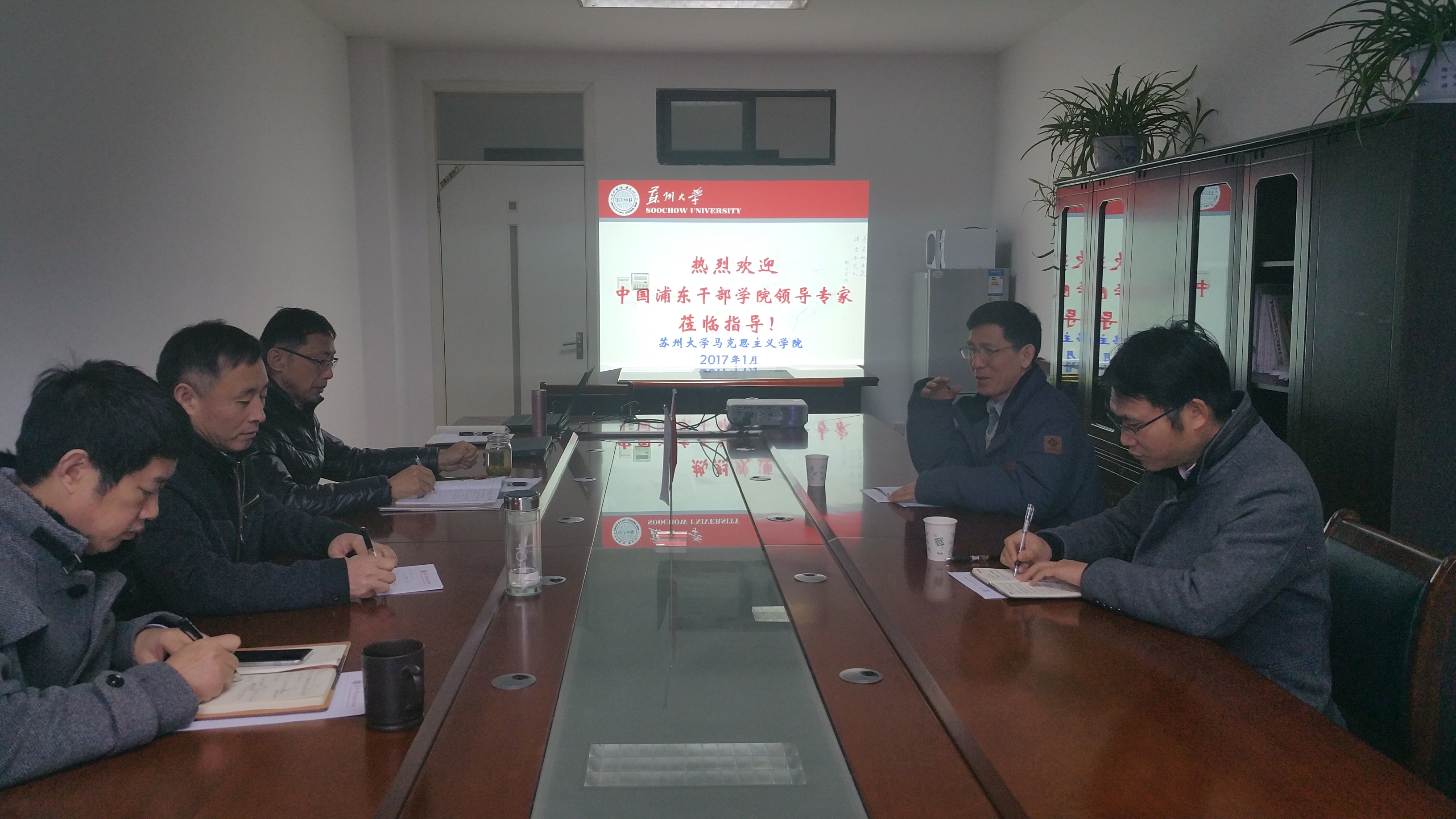 2017年1月18日,应马克思主义学院院长田芝健教授邀请,中国浦东干部学院中国特色社会主义研究基地、中国特色社会主义博士后流动站、公共管理教研部主任于洪生教授,教研部党支部书记李德副教授等莅临马克思主义学院,就马克思主义理论学科建设、苏州大学江苏省中国特色社会主义理论体系研究基地建设及干部培训工作进行调研指导,并与苏州大学马克思主义学院洽谈合作事宜。马克思主义学院党委书记张才君教授,院长、博士生导师田芝健教授,副院长许冠亭教授,苏州大学江苏省中国特色社会主义理论体系研究基地主任助理吉启卫、马克思主义理论博士后流动站办公室主任、院机关支部书记李文娟参加了交流会谈。交流会谈由李文娟同志主持。