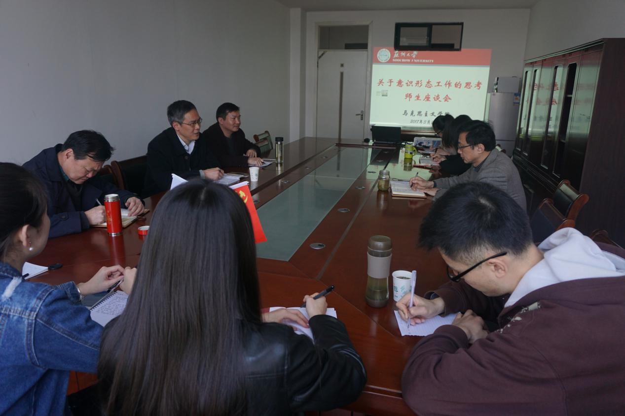 3月27日下午,校党委宣传部在我院会议室召开主题为“关于意识形态工作的思考”师生座谈会。党委宣传部部长陈晓强、副部长余敏江、我院党委书记张才君、副院长许冠亭、博士生导师姜建成,综合办公室主任刘慧婷、博士后刘红晋以及多位硕士研究生参加了此次座谈会。会议由张才君书记主持。 座谈会上,陈晓强部长以全国高校思想政治工作会议中习近平总书记讲话精神为出发点提出做好意识形态工作的重要性,他指出要认真学习,深刻领会,以习近平总书记讲话精神指导教育教学改革,指导思想政治教育工作。苏州大学积极贯彻落实相关文件精神,马克思主义学院更要发挥主战场、主渠道、主阵地、主力军作用。 姜建成教授提出马克思主义学院的每一步发展都需要党委宣传部的引领,在宣传部指导下推进我院建设。党中央对思想政治工作、意识形态工作高度重视,学校也高度重视马克思主义学院的发展,从学院自身来看,机遇与挑战并存。姜教授指出,加强意识形态工作,要突出马克思主义学院的重要特殊位置,发挥马克思主义学院的关键性作用。 张才君书记指出中央重视马克思主义学院,重视马克思主义理论学科建设在苏州大学马克思主义学院有所体现。我院独立组建近两年以来,取得了一定的成绩,如获得省重点学科-马克思主义理论,获批江苏省高校首批示范马克思主义学院等,学院机构建设也逐步完善。但仍然面临许多问题,如绩效和人才引进等。希望学校从重视意识形态工作的高度来关心马克思主义学院的发展。 最后,陈部长希望学院深入学习习近平总书记系列重要讲话与中央31号文件精神,切实落实到马克思主义学科建设与思想政治理论课教学工作之中,为推动学校新形势下思想政治工作作出更大贡献。