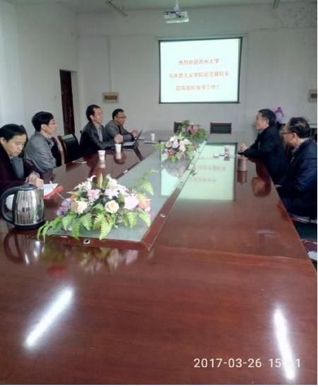 3月26日下午,田芝健院长一完成在中国井冈山干部学院的培训活动,就来到位于吉安的井冈山大学进行调研交流。井冈山大学马克思主义学院院长刘家桂、副院长杜辉及部分教师参加了座谈会。 刘家桂院长、田芝健院长分别介绍了所在学院教学科研、学科建设、专业建设及学院办学特色。双方洽谈了下一步合作事宜:关于利用特色教学资源开展教学改革合作;关于学科建设方面合作,苏州大学马院拟在井冈山大学马院设立研究生工作站,聘请井冈山大学马克思主义学院教师担任研究生工作站指导教师;关于互设学生实践研修基地方面进行合作;关于学生考研方面合作,苏州大学马院与井冈山大学马院共建研究生优质生源基地,欢迎井冈山大学马院优秀毕业生报考苏州大学马克思主义理论等学科研究生;关于社会服务领域合作,苏州大学和井冈山大学都是教育部思想政治教育教师实践研修基地,两个学院在教师和干部培训方面可以进行深度合作;关于教师培养方面的合作,可以互相交换教师,到对方单位工作服务一个学年(或一学期),达到共同提高目的;关于科学研究方面的合作,在科研上相互支持,共同推进地方高校马克思主义学院和马克思主义理论学科之间的合作。 26日下午座谈会结束后井冈山大学党委常委、副校长陈小林教授会见了苏州大学马克思主义学院院长田芝健教授。对两校马克思主义学院之间的交流与合作表示充分肯定和大力支持。 27日上午井冈山大学党委副书记、校长曾建平教授会见了苏州大学马克思主义学院院长田芝健教授,表示高度肯定和大力支持两校马克思主义学院之间开展交流与合作。 随后,田芝健应邀到井冈山大学艺术学院调研,与艺术学院党委书记杨芳、副院长康煜进行了交流和工作商谈。井冈山大学设有教育部红色经典艺术教育示范基地、音乐学国家级特色专业、音乐舞蹈史诗《井冈山》、井冈山红色经典艺术研究与传承发展中心、环境陶艺与公共艺术研究中心、大学生艺术创新创业基地。音乐舞蹈史诗《井冈山》多次到中央国家机关、中国井冈山干部学院、有关高校演出,深受好评。 27日晚上,田芝健教授应邀作了题为“马克思主义政党的建设和党内治理的理论与实践”的学术讲座。在讲座互动环节,田芝健教授回答了同学的提问。井冈山大学的同学听课认真、提问前沿性强。 田芝健院长邀请井冈山大学有关领导、专家参加四月底在苏州大学召开的全国高校马克思主义理论学科研究会学科论坛。刘家桂、田芝健两位院长表示,愿意在共同推进地方高校马克思主义理论学科建设和高校思想政治理论课协同创新等方面开展富有成效的合作。