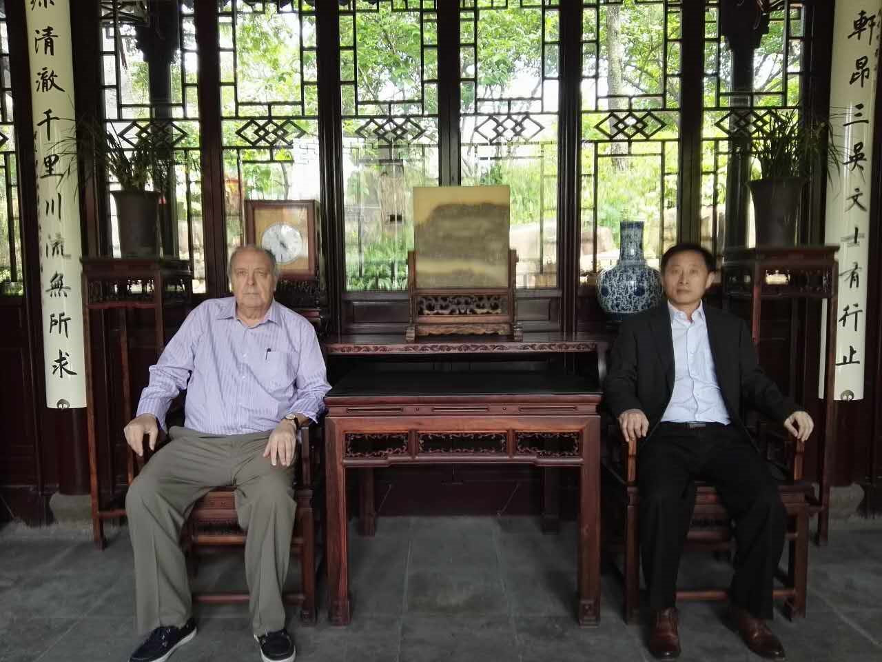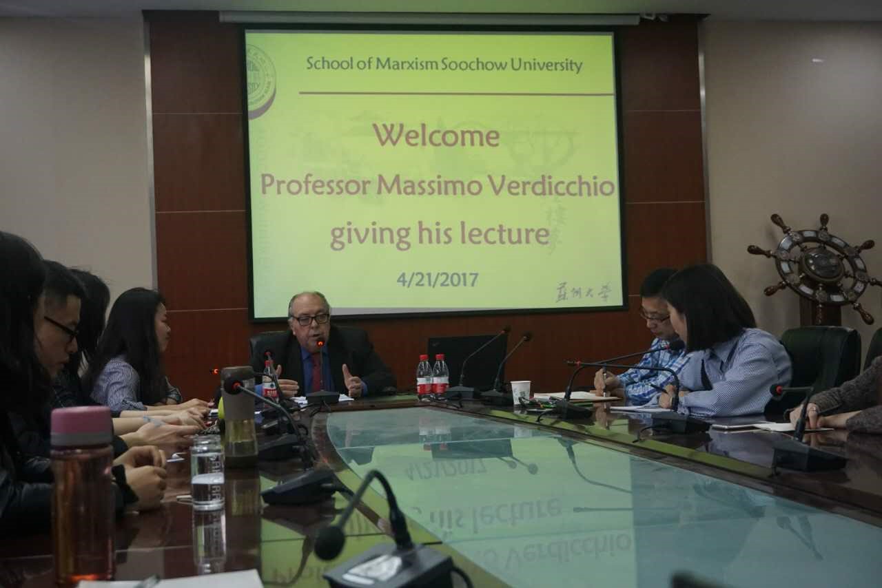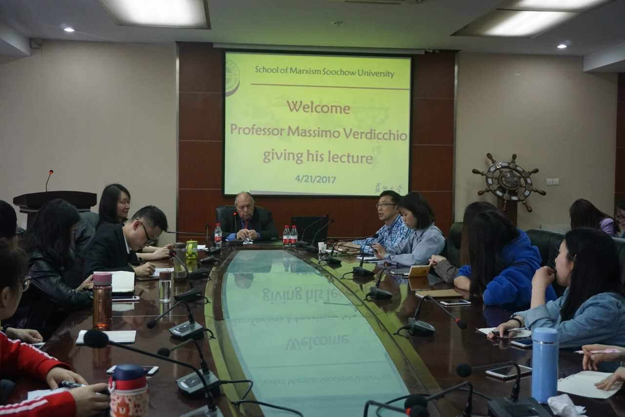 22日,田芝健院长会见了Massimo教授并进行了会谈。田芝健院长对Massimo教授为学院研究生开设讲座表示感谢,表示因为出差未能亲耳聆听Massimo教授的讲座。学院愿与阿尔贝塔大学等高校的有关学院开展立德树人方面的交流与合作,Massimo教授表示愿意作为双方联系的桥梁,共同推动人才培养创新。Massimo教授在田芝健院长等的陪同下参观了美丽的苏州大学本部、新校区校园和马克思主义学院合作共建单位沧浪亭(世界文化遗产)及可园,沧浪亭·可园管理处薛志坚主任亲自英文讲解并向Massimo教授赠送了《沧浪亭志》。