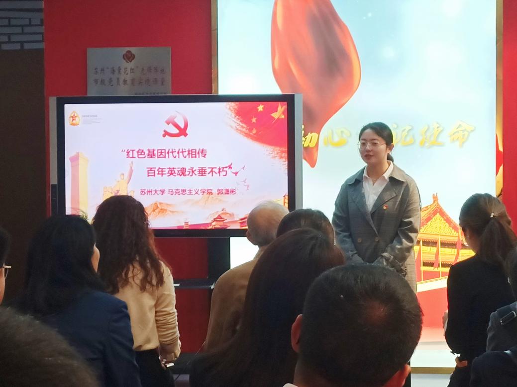 全体党员青年成员一同在苏州大学博物馆党员实践课堂进行微党课学习和交流。苏州大学马克思主义学院“党史学习教育宣讲团”博士生郭潇彬以“透红色基因代代相传 百年英魂永垂不朽”为主题给全体党员上了一堂微党课,通过讲述红色基因之源——中国共产党成立、红色基因之孕育——伟大的中国精神以及红色基因之践行——热血东吴人三个部分的故事,阐述红色基因具有鲜明的时代内涵和时代价值。