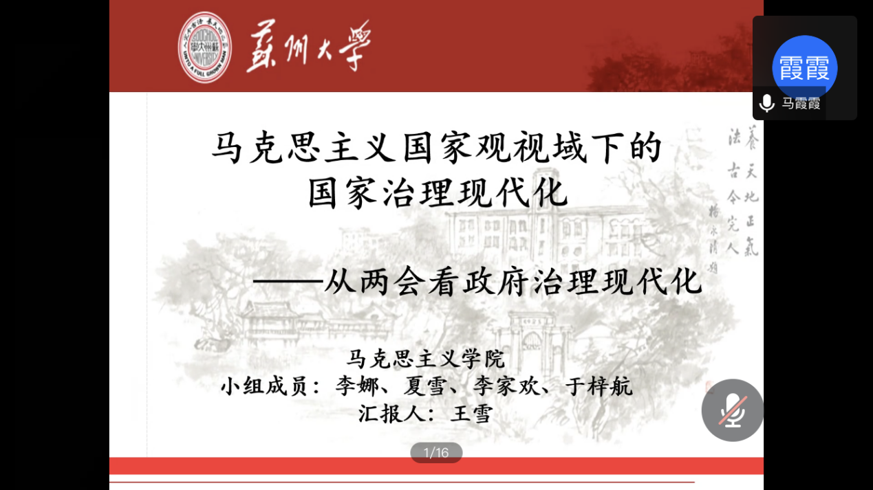 王雪作了题为《马克思主义国家视域下的国家治理现代化——从两会看政府治理现代化》的报告。她从马克思主义视域下国家治理体系和治理能力现代化角度分析了经典马克思主义中的国家观和国家治理思想,在此基础上指出,国家治理现代化的核心是政府治理现代化。从两会角度看政府现代化治理,并提出以政府治理现代化推进国家治理现代化的措施。