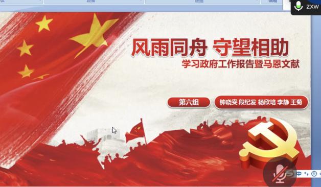 钟晓雯作了题为《风雨同舟,守望相助——学习政府工作报告暨马恩文献》的报告。她首先对政府工作报告进行了概述,对我国2019年和今年以来的工作做了回顾,对今年发展主要目标和下一阶段工作总体部署做了介绍;其次,又解读了政府工作报告的亮点之处,包括在GDP增长目标、保基层运转、新型基础设施建设、就业、财政政策、公共卫生体系等方面;最后她结合了马克思主义学说分析了“一国两制”在新时期的实践。随后,刘乐之、李鑫分别从就业、脱贫方面就这一主题分享了看法。