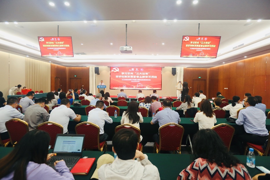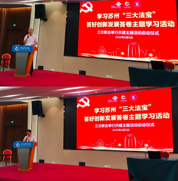 苏州工业园区科技发展有限公司董事长徐健在致辞中对苏州大学马克思主义学院、中国联通苏州工业园区分公司的到来表示欢迎,并表示科技园作为一个有一千六百多名党员的团队,和共建单位开展深度合作有利于彼此相互促进和推动。此次邀请苏州大学马克思主义学院刘慧婷博士领学苏州“三大法宝”,是帮助大家提升干事创业精气神的好机会,衷心希望三家单位通过此次联学活动作为合作新开端,期待今后能够展开深入交流和协作。苏州联通党委成员、苏州联通副总经理徐伟斌表示在2020年7月1日党的生日即将到来之际,为推进共建工作,落实共建成果,以此特殊的方式开展三方联合共建深度合作,在苏大马院的理论指导下、科技发展公司的实践经验中,苏州联通园区分公司进行党建创新工作,旨在共同打造一个崭新的党建品牌先锋。此次的三方联合结对共建是党建工作的创新与突破,他代表苏州联通党委对苏大马院的领导专家为今天党课的精心准备以及科技发展公司领导同事对今天活动的大力支持,表示衷心的感谢!苏州大学马克思主义学院党委书记张才君认为三方共聚科技园举办主题党建学习活动是合作的一个新起点,科技园入驻了众多知名企业,先进的管理理念、服务指标以及团队精神使人印象深刻。此次活动可以更好地持续深入学习习近平新时代中国特色社会主义思想,学习好党的十九大精神、十九届二中、三中、四中全会的精神,用党建工作来引领各单位的管理体系和治理能力的现代化,用党建推动各项事宜的进步。期待在接下来的合作中可以在党建基层组织建设、党建课题开发、党建资源共享、党员教育等一起努力合作,收获更多的前景。