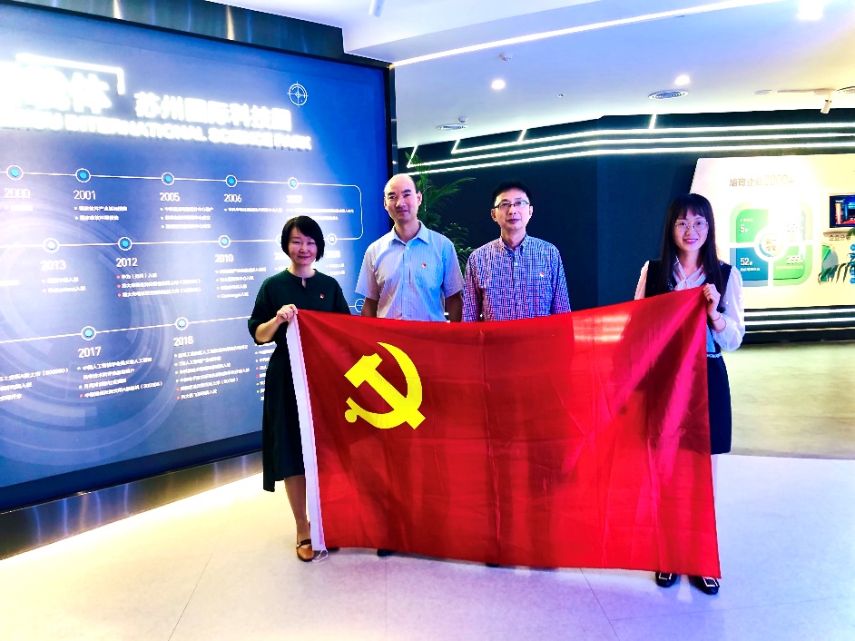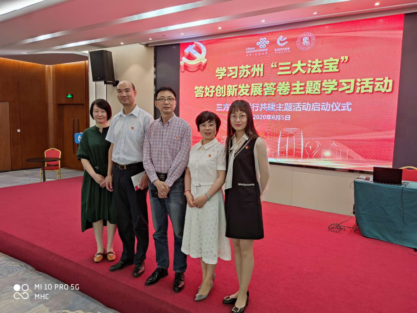 习近平总书记多次强调“新时代是奋斗者的时代”,在2020年七一建党节即将到来之际,苏州大学马克思主义学院、中国联通苏州工业园区分公司、苏州工业园区科技发展有限公司于6月5日联合举办迎七一“学习苏州‘三大法宝’ 答好创新发展‘答卷’”共建主题学习活动。苏州大学马克思主义学院党委书记张才君、副院长茆汉成、综合办公室主任刘慧婷、机关党支部书记、教学科研办公室主任李文娟、研究生党支部书记金鑫一行到苏州工业园区人工智产业园参加活动。苏州工业园区科技发展有限公司董事长徐健和党员代表、苏州联通党委成员、苏州联通副总经理徐伟斌、苏州联通园区分公司党支部书记、总经理周小金、苏州联通园区分公司党支部纪检委员、园区分公司副总经理回传栋、宣传委员、园区分公司副总经理时晶莹、组织委员杨晔等参加活动。