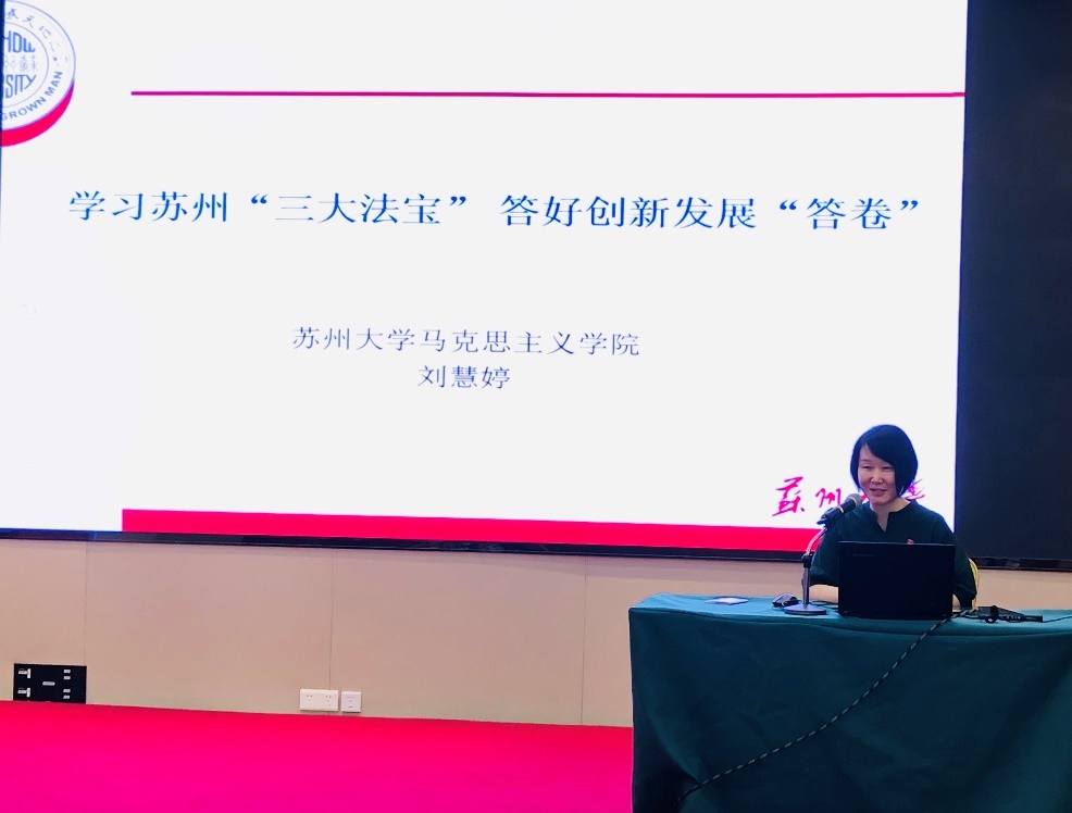 苏州大学马克思主义学院综合办公室主任刘慧婷博士围绕三方面对“学习苏州‘三大法宝’ 答好创新发展‘答卷’”主题进行了解读:1.认真学习苏州“三大法宝”的核心要义;2.深刻领会蓝绍敏书记的要求;3.新时代创新创业再出发的深入思考。她指出,在改革开放的伟大实践中,苏州“三大法宝”形成并引领苏州走在了全国发展前列,生动演绎了伟大改革开放精神,是苏州最为宝贵的财富,是“江苏精神”的重要体现。今天的苏州,以占全国不到0.1%的土地、0.7%的人口,创造了超过全国2%的地区生产总值和地方一般预算收入,实现了全国7.7%左右的进出口总额,综合实力位居全国发展前列,经济发展、开放创新、城乡一体、精神文明、社会和谐、生态文明等领跑全省、全国。苏州能够率先全国不断发展、能够超越自我不断创新、能够正确选择更高目标并勇往直前的深层动力和制胜之道就在于苏州形成了“张家港精神”“昆山之路”“园区经验”这“三大法宝”。她倡议,新时代的广大党员干部要站在新起点上,进一步激发苏州“三大法宝”的党性基因、进一步弘扬苏州“三大法宝”的实干精神、进一步传承苏州“三大法宝”的使命担当。