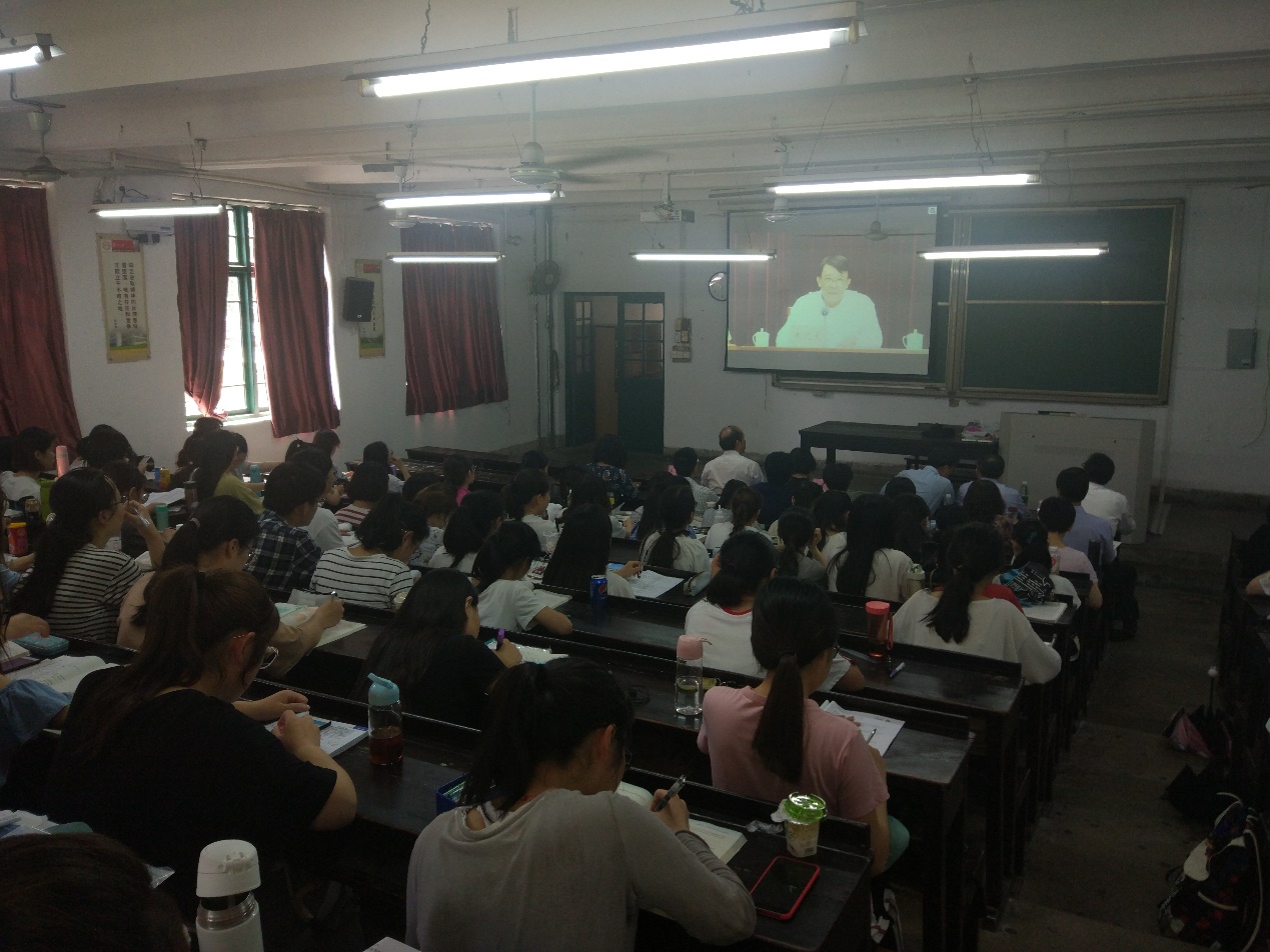 为进一步贯彻落实教育部教材局《关于做好高校思想政治理论课2018年版教材使用培训的通知》,帮助广大师生更好地把握高校思想政治理论课2018年版教材的主要内容和基本精神,切实用好新教材,2018年5月14日下午14:30,我校组织相关师生代表在校本部鸿远楼103教室参加全国高校思想政治理论课2018年版教材使用培训高校分会场的开班式。校党委副书记邓敏、副校长蒋星红、教务部教学运行处副处长刘方涛,马克思主义学院党委书记张才君、院长田芝健,马克思主义学院朱蓉蓉教授、中国近现代史纲要教研部主任孙锡平以及范敏华、林慧平、高志斌、郭秋琴、谢贵兵、段星、李燕、耿俊丽等老师和马克思主义理论学科研究生代表、部分本科生,共同观看了开班式。