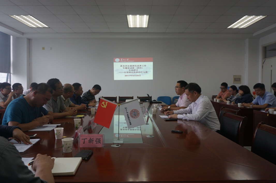 为加强学员学习理解,切实将所学知识与岗位工作紧密结合起来,9月23日下午,在苏州大学马克思主义学院会议室举行了“全面深化改革工作的行与思”的互动研讨交流。培训班全体学员,苏州大学博士生导师、马克思主义学院院长田芝健教授,马克思主义学院干部学院办公室主任、马克思主义政党与国家治理研究中心副主任吉启卫等参加了互动研讨。昌吉州党委办公室副主任吕养旭,昌吉州党委组织部调研室副主任、主任科员赵宏强,呼图壁县委改革办副主任科员王利群,昌吉州州经信委信息化推进科副科长张婷,昌吉州住房和城乡建设局高级经济师王晓莉等围绕如何加强基层党建创新、如何更好促进城镇一体化发展、如何加强特色小镇培育建设,如何使农民更富农村更加稳定等问题与田芝健院长进行了深入探讨交流,田芝健教授针对各位领导学院所提出的问题,当场进行了回应并提出了有关对策建议。研讨交流互动效果好,教员与学员在互动研讨中不断迸发思想火花,共同提高了对有关理论和实际问题的理解和认识。