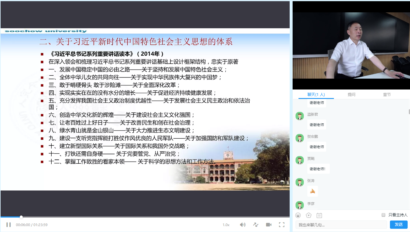 由苏州大学继续教育学院和苏州大学马克思主义学院共同负责的苏州大学基层党建培训学院,精心安排了8场“云”课堂,由苏州大学马克思主义学院院长兼苏州基层党建培训学院院长田芝健教授等8位授课老师根据学员情况设计课程。从习近平新时代中国特色社会主义思想解读、党的基本知识学习、端正入党动机、中共党史解读等方面进行专题辅导,为学员们送上“党课套餐”,把丰富的知识通过直播形式带给山西的学员们。