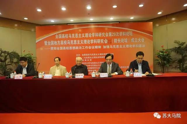 2017年4月29日,全国高校马克思主义理论学科研究会第29次学科论坛暨全国地方高校马克思主义理论学科研究会(院长论坛)成立大会在苏州大学举行。中国社会科学院马克思主义研究学部委员、苏州大学马克思主义研究院名誉院长靳辉明教授,教育部社科司刘桂芹司长,中共江苏省委宣传部理论处许益军处长,江苏省教育厅社政处王伟处长,全国高校马克思主义理论学科研究会副会长、清华大学马克思主义学院院长艾四林教授、南开大学马克思主义学院武东生教授、复旦大学马克思主义学院顾钰民教授、中山大学钟明华教授等来自全国24个省、直辖市、82所高校的马克思主义学院的院长、书记、专家教授,重点期刊主编,苏州大学党委副书记、纪委书记高祖林,学校相关职能部门学院、马克思主义学院部分师生代表等共计200余人参加了会议。