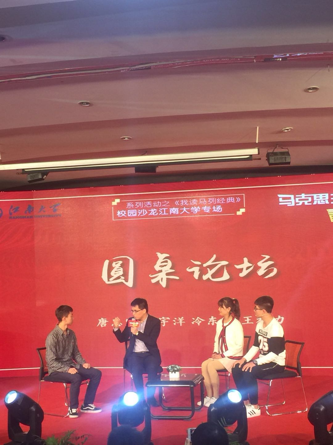 本次校园沙龙活动在《共产党宣言》的朗读声中拉开序幕,江南大学党委书记朱拓教授致辞。活动分四个篇章。第一篇章是思想之魂,由长江学者特聘教授、南京师范大学人文社会科学研究院院长王永贵教授就“任何真正的哲学都是自己时代的精神上的精华”发表了主旨演讲。第二篇章是光明之路,江南大学陈绪新教授讲述了《让历史告诉未来》,阐述了“思想要得到实现,就要有使用实践力量的人”的道理。江南大学中国特色社会主义理论宣读团的代表讲述了《让我们为马克思主义代言》的昨天与今天的精彩故事。现就读东南大学博士的校友杜聪以及江南大学国旗班成员讲述和表演了《那些年,马克思主义带给我们的力量》的动人故事。江南大学社会科学处处长刘焕明教授作了有深度的点评。第三篇章是生命之美,江南大学马克思主义学院副教授蔡瑶朗诵了马克思《给父亲的信》:“永远对你敬爱的儿子!”,江南大学人文学院的庄若江教授作了有温度的点评。第四篇章是存在之思。江南大学的唐忠宝老师与三位同学周宇洋、冷东哲、王梓力进行了圆桌论坛。活动表现出师生之间良好的交流与沟通,反映了唐老师较强的思辨能力、语言表达能力以及对马克思主义原理的良好把握,也展示了唐老师接地气故事的感染力。最后全体与会人员直立,在《国际歌》声中圆满结束。