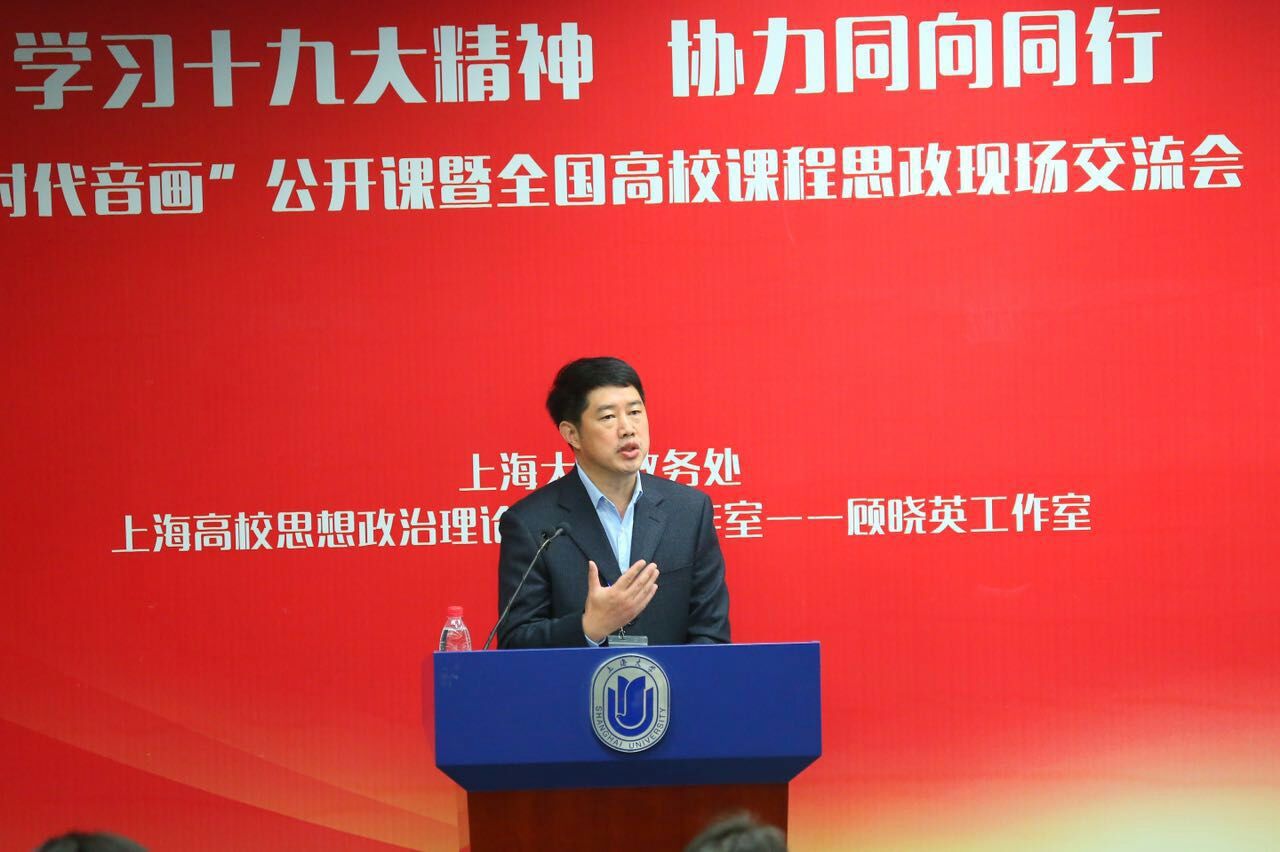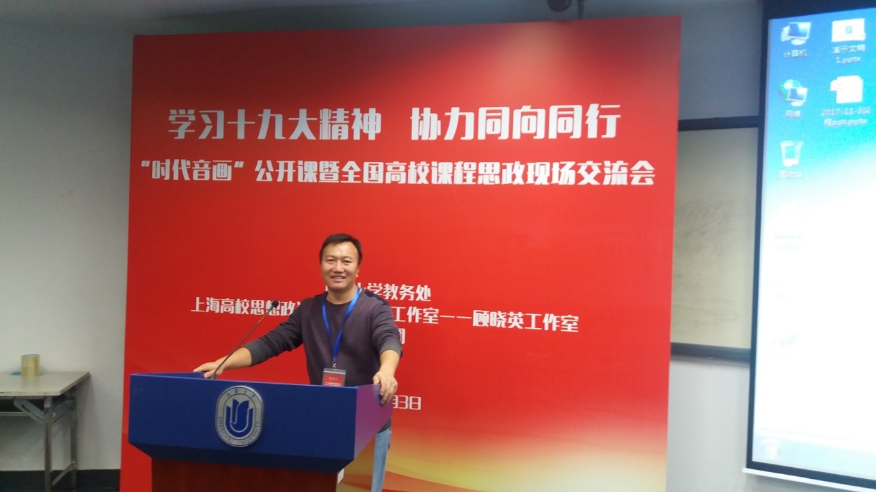 2017年11月3日,上海大学宝山校区举办“时代音画”公开课暨全国高校“课程思政”现场交流会。会议由上海大学教务处、上海高校思想政治理论课名师工作室——顾晓英工作室、北京超星尔雅教育科技有限公司联合举办,目的是为了深入对标党的十九大精神,进一步研讨高校各门课程与思想政治理论课同向同行的途径与方法,总结“课程思政”经验,分享“全程全员育人”成果,探索“立德树人”新机制。上海大学副校长聂清、上海大学教务处副处长顾晓英等与来自全国各地的100多位专家、学者和思想政治理论课教师观摩公开课并进行深入的交流研讨。苏州大学马克思主义学院副院长许冠亭教授、罗志勇老师参加了相关活动。