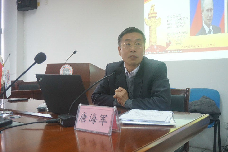 讲座伊始,唐海军研究员由一组国际上从中共17大到19大的贺电总数和致电领导人当选的电报总数的对比数据切入,为师生们呈现了国际社会愈来愈重视中国共产党全国代表大会这一事实,随后从三部分详细解读了国际社会对中共十九大的认知情况。