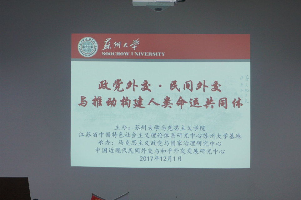2017年12月1日上午,由苏州大学马克思主义学院、江苏省中国特色社会主义理论体系研究中心苏州大学基地主办,马克思主义政党与国家治理研究中心、中国近现代民间外交与和平发展研究中心等承办的“政党外交·民间外交与推动构建人类命运共同体”学术研讨会在苏州大学独墅湖校区举行。