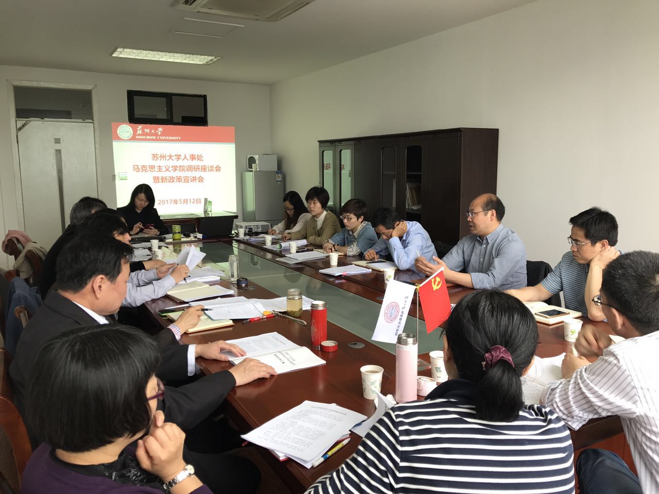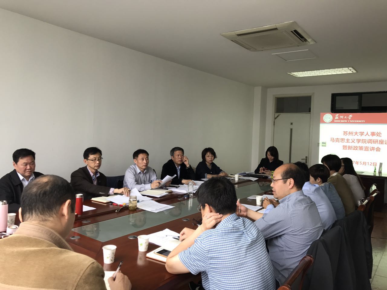2017年5月12日上午,苏州大学人事处处长、校岗位设置与聘用工作领导成员、领导小组办公室主任刘标率领调研组到马克思主义学院召开调研座谈会暨新政策宣讲会。人事处副处长何峰、副处长何德超、人事科副科长朱雯、人才开发办主任杨凝晖、综合科科长章宪、处长助理庄友刚(挂职)等来院调研指导,就专业技术职务聘任、岗位聘用等进行调研和岗位分类管理新政策进行解读与宣讲。学院党委书记张才君、院长田芝健、副院长许冠亭、院综合办公室主任刘慧婷,博士生导师方世南教授、姜建成教授,朱蓉蓉教授,李莉、程云蕾、高志斌老师、组织人事秘书李文娟等教师代表参加了座谈会。
