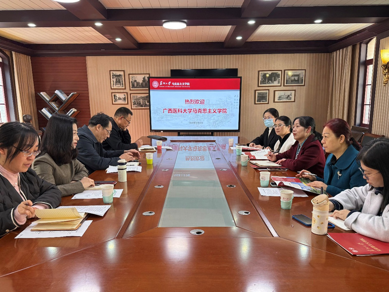 杨海秀对苏州大学马克思主义学院的热情接待与细致安排表示感谢,并介绍了广西医科大学马克思主义学院在办学历史、人才培养、教学科研等方面的基本情况。她表示,希望以此次交流为契机,进一步深化两院之间的合作,共同推动马克思主义学院实现内涵式高质量发展。与会教师围绕人工智能与思政课融合、思政教师队伍建设、马克思主义学院发展路径等议题展开深入讨论,广泛交流意见,形成多项共识。
