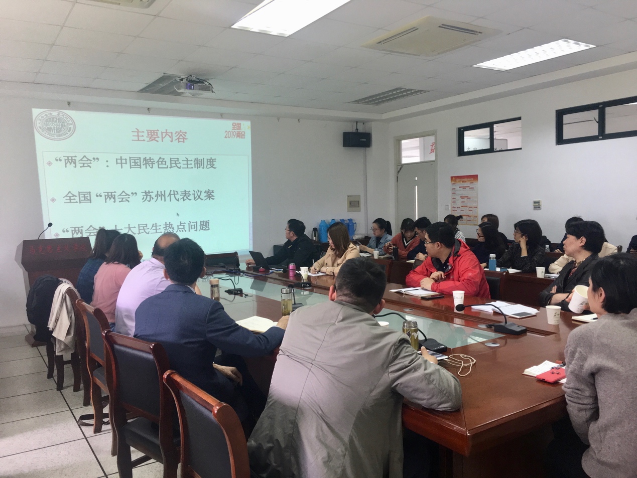 教学内容示范讲授环节,由苏州大学文正学院思政教研部主任唐强奎及苏州大学“形势与政策”教研部主任杨余春进行。唐老师作了关于《聚焦“两会”,关注民生》的讲座,他围绕中国特色民主制度 、全国“两会”苏州代表议案、“两会“十大民生热点问题进行讲解,杨老师则用“五四运动”、“五四精神”、“历史意义”、“当代价值”、“时代新人”等关键词进行了《用“五四精神”锻造“时代新人”》的讲座,两位老师理论联系实际,深入浅出,既讲授了理论要点,也指出了课程讲授过程中的具体教学组织形式、展开方式和实施效果,起到了很好的示范和展示作用。
