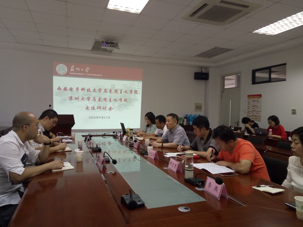 2018年9月12日下午,西安电子科技大学马克思主义学院调研组前来我院交流研讨。西安电子科技大学马克思主义学院“概论”教研室主任赵常兴副教授、基础教研室杨伟刚副教授、心理健康中心武成莉副教授与苏州大学马克思主义学院党委委员、院长田芝健教授,副院长许冠亭教授,概论教研部主任唐强奎副教授, 概论教研部副主任陈枢卉副教授,罗志勇老师和李燕老师就思想政治理论课建设、马克思主义理论学科建设等进行了交流研讨。研讨座谈会由院党委委员、副院长许冠亭教授主持。学院党委书记张才君教授,院党委委员、副院长朱蓉蓉教授,院党委委员、马克思主义研究院副院长姜建成教授等也与调研组进行了交流。