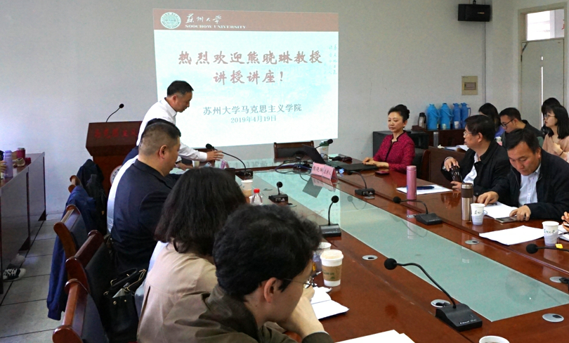 4月19日下午,中央马克思主义理论研究与建设项目工程专家、教育部高等学校思想政治理论课教学指导委员会委员、北京师范大学马克思主义学院副院长,北京高教会马克思主义原理研究会副会长、北京市高教会研究生思想政治理论课研究会副理事长熊晓琳教授应邀于苏州大学独墅湖校区606号楼6418会议室作主题为“新时代高校思政课教学改革的若干思考”的讲座。苏州大学马克思主义学院、苏州健雄职业技术学院思想政治理论课教师,马克思主义学院硕、博研究生参加了本次讲座。讲座由马克思主义学院田芝健院长主持。