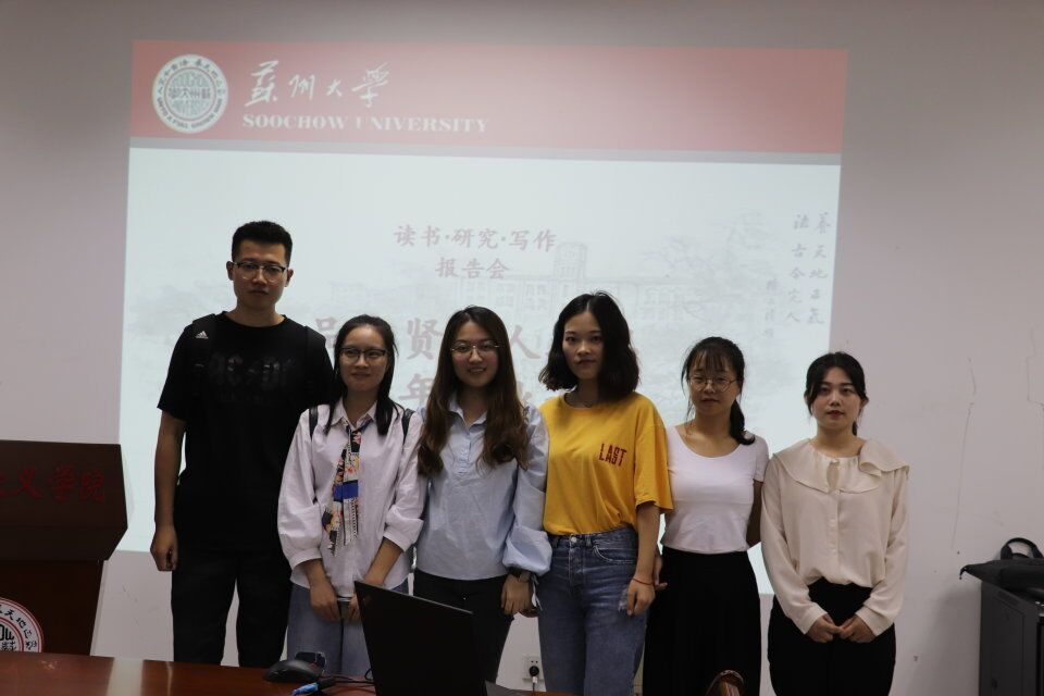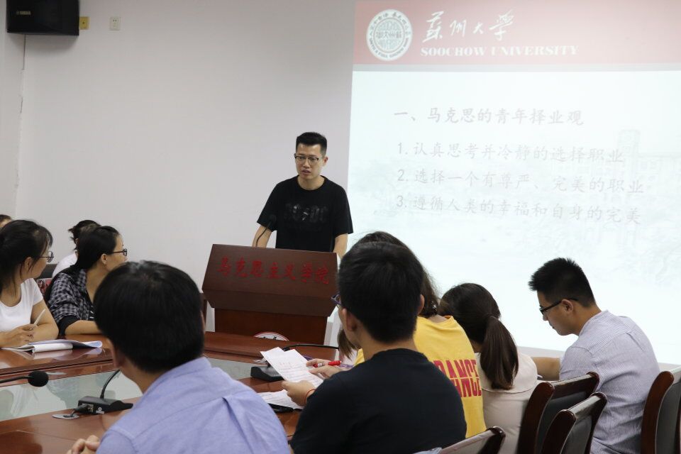 9月26日晚,苏州大学马克思主义学院于独墅湖校区606-6418举行了马克思主义理论学科研究生新学期第一次“读书·研究·写作”报告会。2018级全体硕士研究生分为六组,基于对马克思《青年在选择职业时的考虑》的原著选读,依次分享了自身阅读感悟。院长田芝健教授、院党委书记张才君教授、院教学科研办公室主任李文娟老师、研究生会主席张巩轶、习近平新时代中国特色社会主义思想研究会会长毛瑞康以及2018级全体硕士研究生参与了此次报告会。报告会由2018级硕士研究生李成、刘珮雯主持。