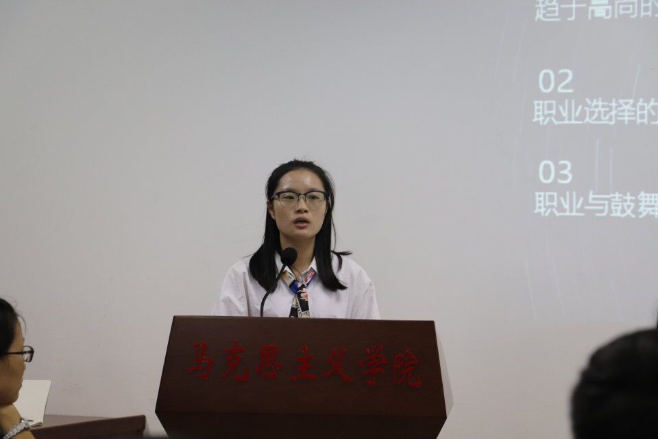 第五组成员代表王欢从马克思的青年择业观、马克思的青年择业观念来源以及马克思的青年择业观的启示三个方面对自己的阅读感悟作了讲解。王欢在报告中说道,青年在选择职业时,要做到个人价值与社会价值的统一。人的价值就在于对社会的贡献,即通过自己的活动满足社会、他人以及自己的需要。个人对社会的贡献是实现人生价值的基础和源泉。