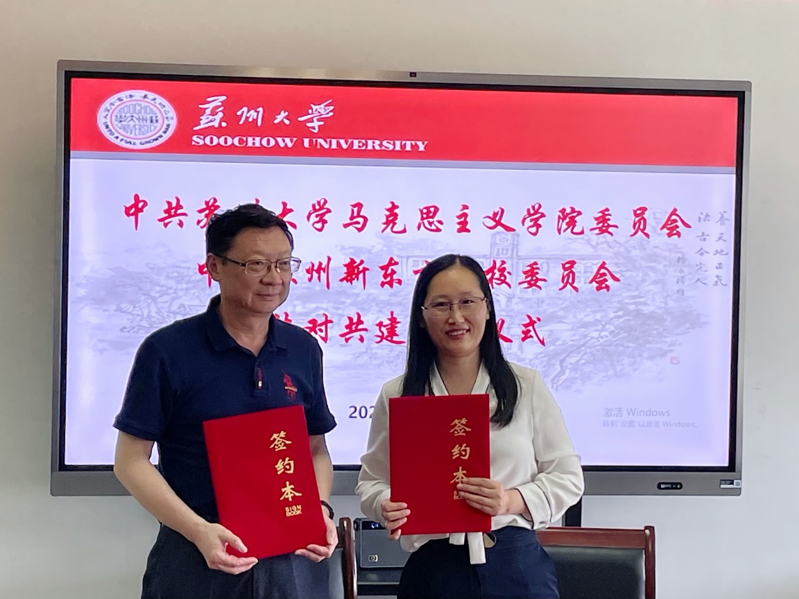 6月25日上午,苏州大学马克思主义学院党委与苏州新东方学校党委在独墅湖校区606#6418会议室举行了结对共建签约仪式。苏州新东方学校党委书记、副校长汪静静,党委委员、党务干事程维娜,苏州大学马克思主义学院党委书记陈建军,团委书记、研究生党支部书记金鑫,学生党员代表等参加签约仪式。仪式由陈建军书记主持。