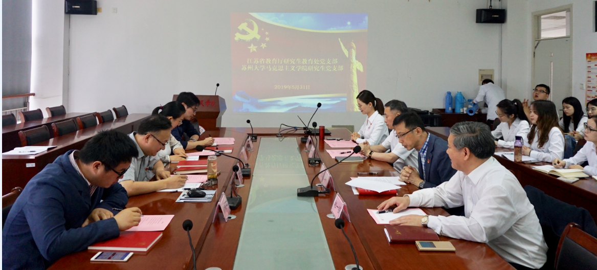 为认真落实江苏省教育厅研究生处党支部联系点制度,推进研究生教育高质量发展,2019年5月31日上午,省教育厅研究生教育处党支部书记杨树兵和刘天宇、徐砚田、袁楠等一行赴苏州大学马克思主义学院,与全国高校样板党支部——苏州大学马克思主义学院研究生党支部开展联合共建主题党日活动,并开展“研究生教育质量提升”专题调研活动。苏州大学研究生院研究生教育管理办公室主任赵一强、马克思主义学院党委副书记田芝健院长及马克思主义学院研究生党支部全体党员参加此次活动。此次活动由马克思主义学院党委书记张才君主持。