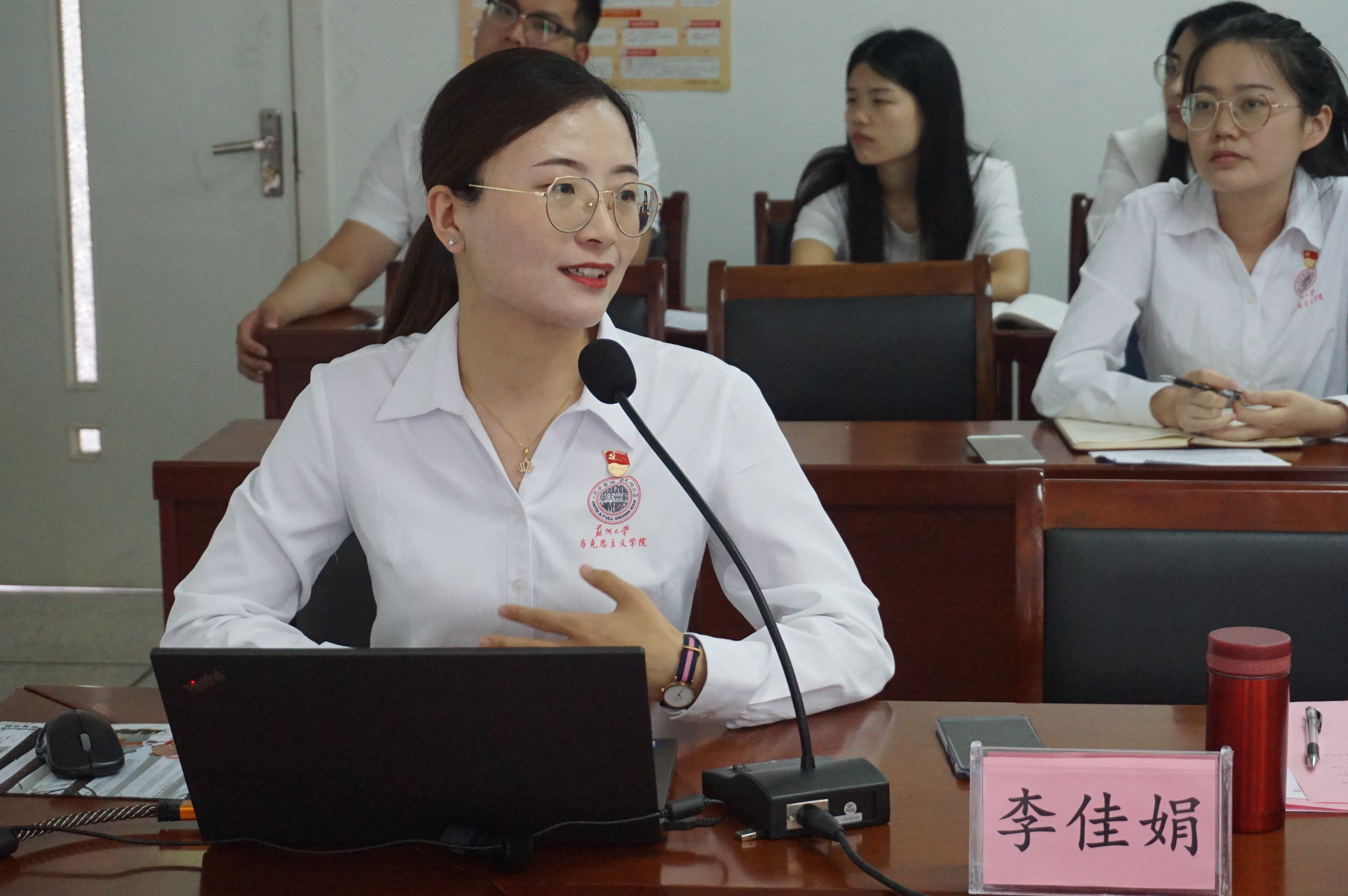 随后,苏州大学马克思主义学院研究生党支部17级博士生党员代表李佳娟同志围绕苏州大学马克思主义学院研究生党支部的情况及开展工作的成果,从支部基本情况、支部特色和支部发展规划三个方面向教育厅领导们做了题为《坚定信仰跟党走 脚踏实地有担当》的工作介绍,并表示苏州大学马克思主义学院研究生党支部在之后的工作中将向着建成品牌型、法治型、服务型、创新型、廉洁型和学习型党支部而不断努力。